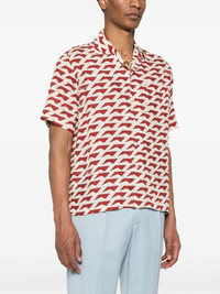 geometric-pattern silk shirt Highlights - Red/cream white - Silk - Twill weave - Satin finish - Geometric-pattern print - All-over logo print - Logo-engraved buttons - Camp collar - Front button fastening - Short sleeves - Chest patch pocket - Short side slits - Straight hem - Unlined Made In United States Composition Silk 100% SIZE & FIT Model measurements Height 6 ft 2 in(1.87 m) Bust/Chest 36.22 in(92 cm) Hips 37 in(94 cm) Waist 27.95 in(71 cm) Measurement CHEST 50.39 in(128 cm) SLEEVE LENGTH 12.2 in(31 cm) LENGTH 29.52 in(75 cm) WAIST 49.6 in(126 cm) Shoulder Width 17.71 in(45 cm) FittingInformation Designed to be unstructured, offering a loose fit throughout Made from a lightweight non-stretch fabric This piece fits true to size – take your usual size