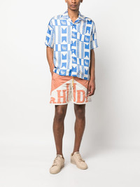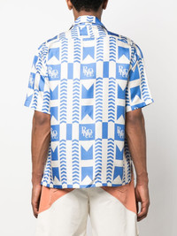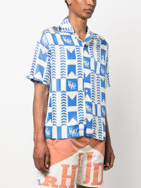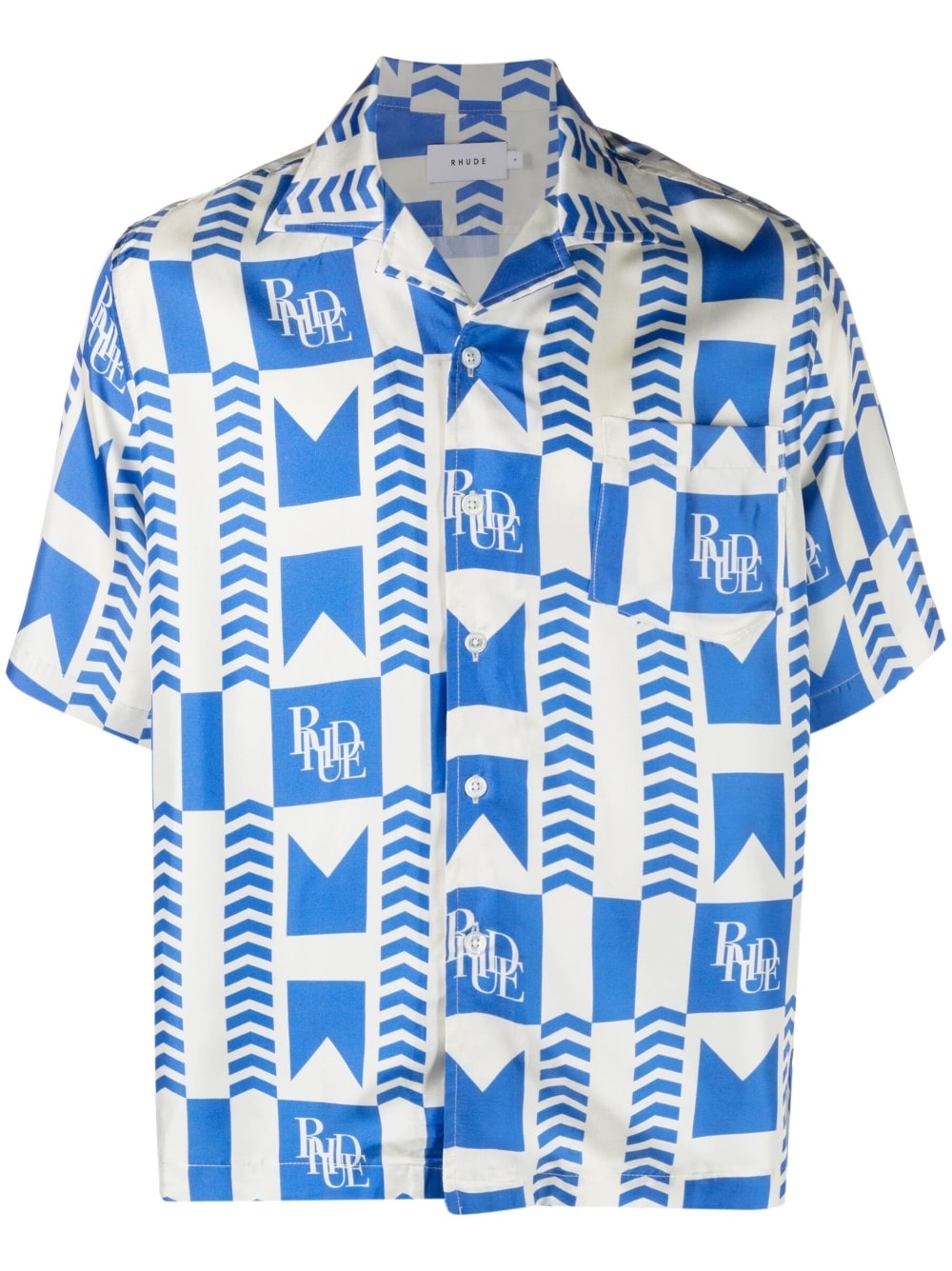 graphic-print silk shirt Rhude pairs punchy graphics with lustrous materials to create this shirt. Made from pure silk, the brand's logo is combined with a racing-style blue chevron pattern all-over. Made in United States Composition Silk 100% SIZE & FIT Model measurements Height 6 ft 2 in(1.87 m) Bust/Chest 37 in(94 cm) Hips 33.85 in(86 cm) Waist 27.95 in(71 cm) FittingInformation Designed to be unstructured, offering a loose fit throughout Made from a midweight non-stretch fabric This piece fits true to size – take your usual size Washing instructions Dry Clean Only