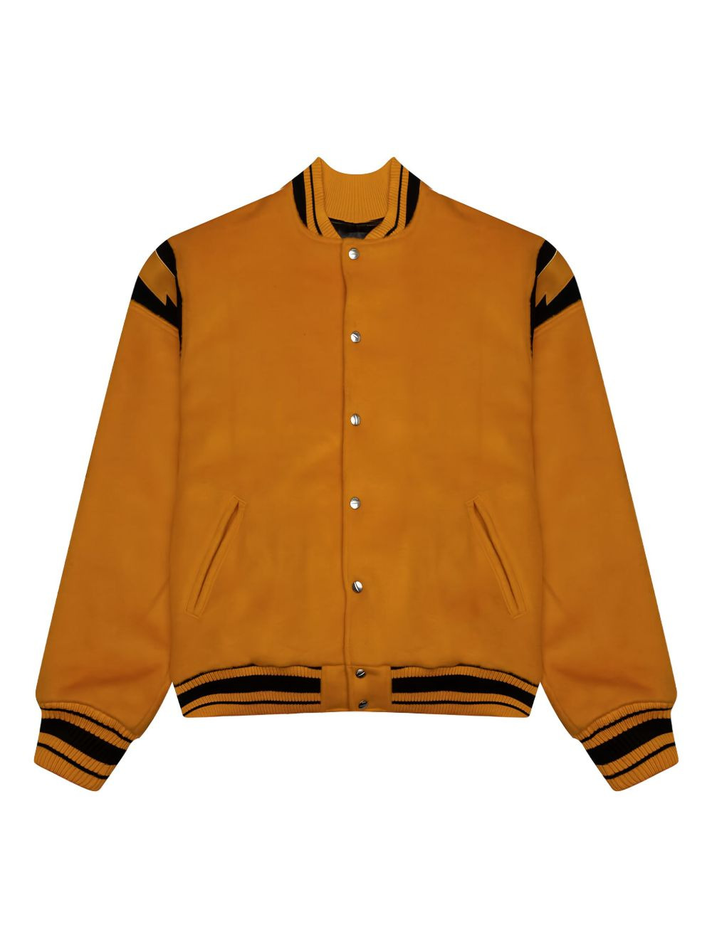 logo-detail bomber jacket Highlights - Mustard yellow - Logo detail - Snap button fastening - Side pockets Made in United States Composition Suede 100% Outer: Wool 90%, Nylon 10% Lining: Polyester 100% Washing instructions Read Manufacturer Guidelines
