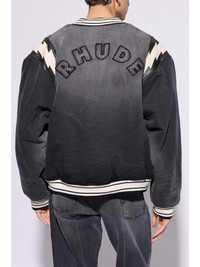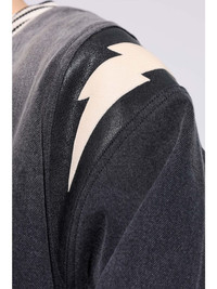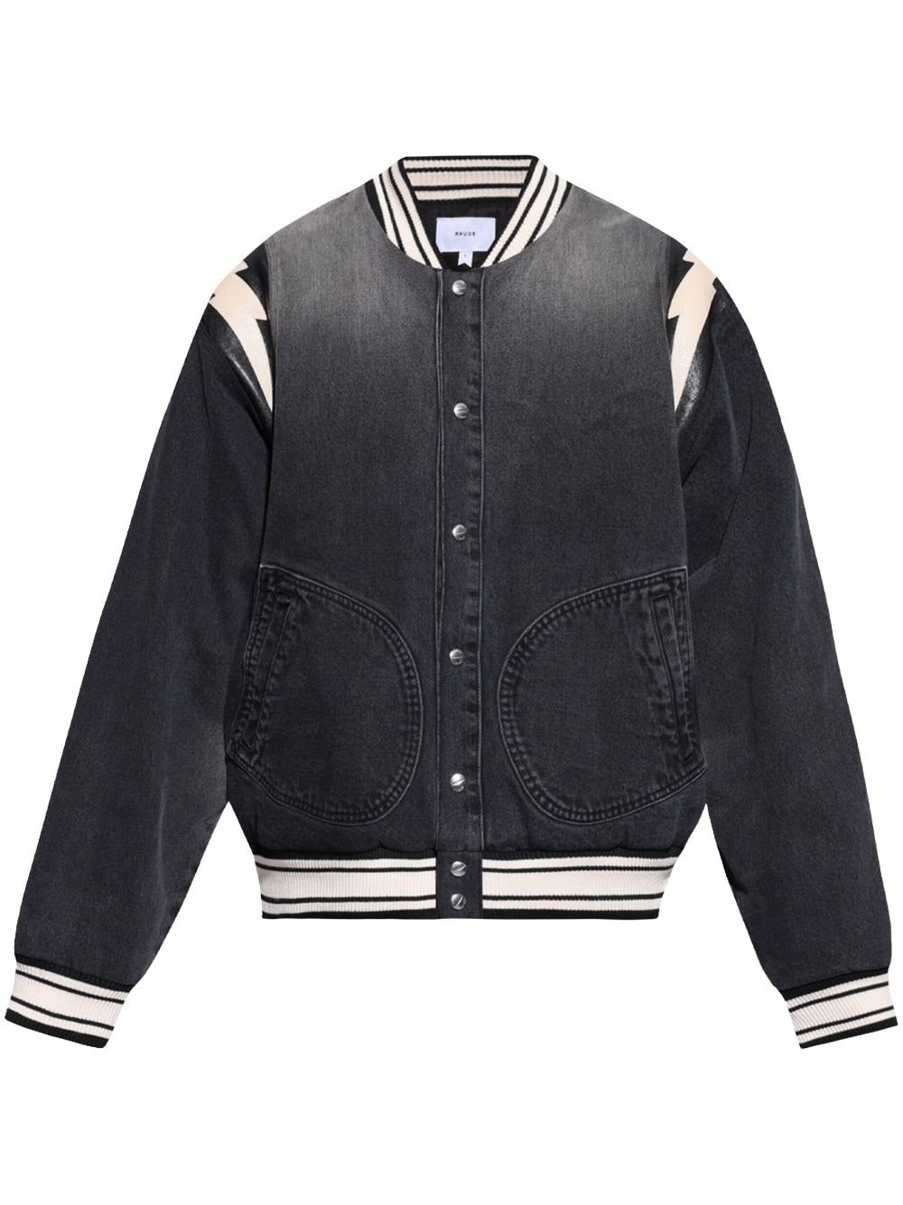 logo-embroidered bomber jacket Highlights - Grey - Cotton - Denim - Leather trim - Panelled design - Gradient effect - Ribbed band collar - Side stripe detailing - Long sleeves - Ribbed cuffs and hem - Two side pouch pockets - Front press-stud fastening Made in United States Composition Leather 100%, Cotton 100%