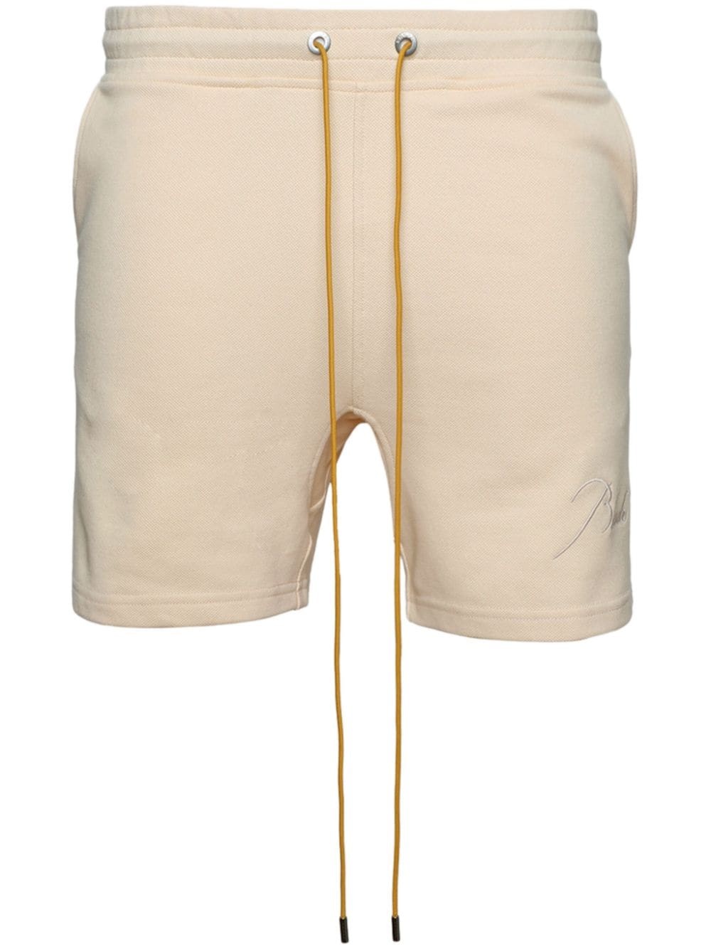 logo-embroidered cotton track shorts Highlights - Cream white - Cotton - Jersey texture - Embroidered logo at the leg - Elasticated drawstring waistband - Two side inset pockets - Rear patch pocket - Straight leg - Above-knee length - Straight hem Made in United States Composition Cotton 100% Washing instructions Dry Clean Only