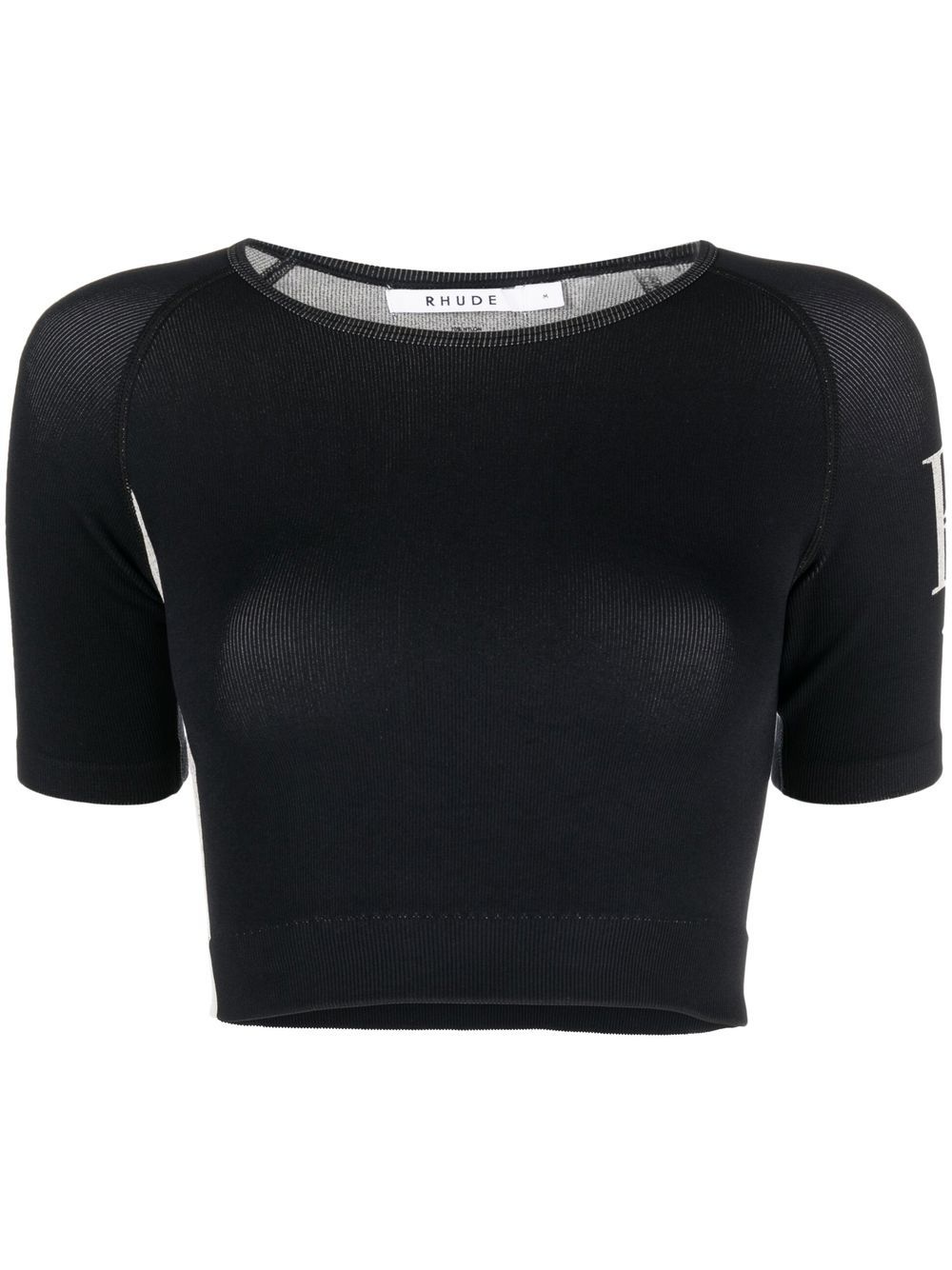 logo-print cropped T-shirt black grey stretch-design logo print at the arm round neck short sleeves cropped straight hem Imported Composition Nylon 70%, Polyester 20%, Spandex/Elastane 10% SIZE & FIT Model measurements Height 5 ft 11 in(1.8 m) Bust/Chest 33.07 in(84 cm) Hips 37.4 in(95 cm) Waist 25.19 in(64 cm) Measurement LENGTH 12.59 in(32 cm) BUST 25.19 in(64 cm) FittingInformation This piece fits true to size. We recommend you get your regular size Cut for a close fit Made with a mid-weight stretch fabric Washing instructions Machine Wash