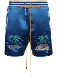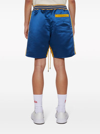 Palm Eagles satin shorts Highlights - Navy blue - Mustard yellow - Lyocell - Satin finish - Embroidered motif - Piped-trim detailing - Elasticated drawstring waistband - Two side inset pockets - Rear patch pocket - Above-knee length Made in United States Composition Lining: Lyocell 100% Outer: Polyester 100% SIZE & FIT Measurement FRONT RISE 13.97 in(35.5 cm) INSIDE LEG 8.26 in(21 cm) WAIST 25.19 in(64 cm) Outside Leg 18.5 in(47 cm) Washing instructions Dry Clean Only