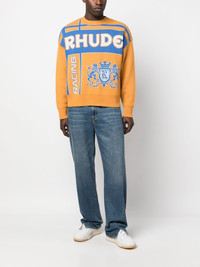 Palm jacquard crew neck jumper Woven from delicate wool into a full jacquard knit, Rhude's Palm crew neck jumper boasts a racing-inspired motif at the front whilst following the brand's craftsmanship and attention to detail. Highlights - Orange/sky blue/white - Wool - Full jacquard - Crew neck - Long sleeves - Ribbed cuffs and hem Imported Composition Wool 70% SIZE & FIT Model measurements Height 6 ft 0 in(1.84 m) Bust/Chest 35.82 in(91 cm) Hips 37 in(94 cm) Waist 28.34 in(72 cm) FittingInformation Designed for a relaxed fit, this piece allows for comfort and movement when worn Made with a midweight knit, this piece offers some stretch This piece fits true to size – take your usual size