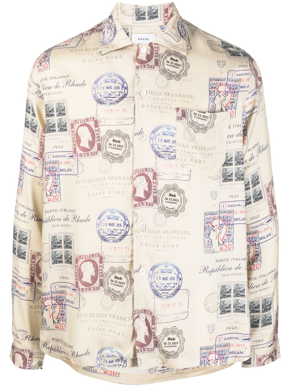 passport stamp print shirt Rhude is a luxury clothing brand known for combining American iconography with nostalgic references. A fine example of the brand's style is this long-sleeve shirt from the SS23 collection, which features a straight cut enhanced by multiple passport stamp prints all over. Highlights - Light beige - Chest patch pocket - Classic collar - Front button fastening - Long sleeves Made in Italy Composition Viscose 100% SIZE & FIT Model measurements Height 6 ft 1 in(1.85 m) Bust/Chest 38.58 in(98 cm) Hips 37 in(94 cm) Waist 30.31 in(77 cm) Measurement CHEST 48.81 in(124 cm) SLEEVE LENGTH 28.34 in(72 cm) Shoulder Width 17.71 in(45 cm) LENGTH 30.7 in(78 cm) WAIST 47.24 in(120 cm) FittingInformation Designed to be unstructured, offering a loose fit throughout Made from a midweight non-stretch fabric This piece fits true to size – take your usual size Washing instructions Dry Clean Only