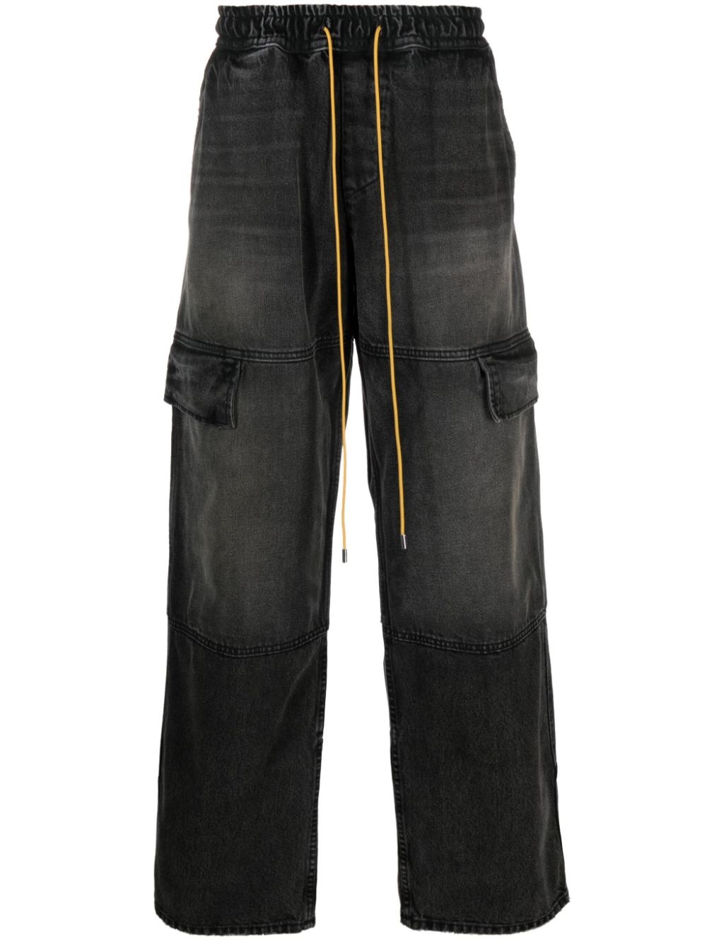 Plateau cargo jeans RHUDE's Plateau jeans are an exaggerated take on workwear styles. They’re panelled from faded black denim to a wide-leg silhouette with myriad flap and cargo pockets and an elasticated drawstring waistband for an adjustable fit. Highlights - Black - Cotton - Washed denim - Elasticated drawstring waistband - Two diagonal pockets to the sides - Two side cargo pockets - Two rear flap pockets - Wide leg Made in United States Composition Outer: Cotton 100% Lining: Polyester 65%, Cotton 35% SIZE & FIT Model measurements Height 6 ft 0 in(1.84 m) Bust/Chest 36.22 in(92 cm) Hips 35.43 in(90 cm) Waist 26.77 in(68 cm) FittingInformation Designed with a wide leg, these jeans offer a loose and roomy fit Adjust this piece’s waistband to your preference using the drawstring Sturdy and hard-wearing, this denim piece offers no stretch This piece fits true to size – take your usual size Washing instructions Machine Wash