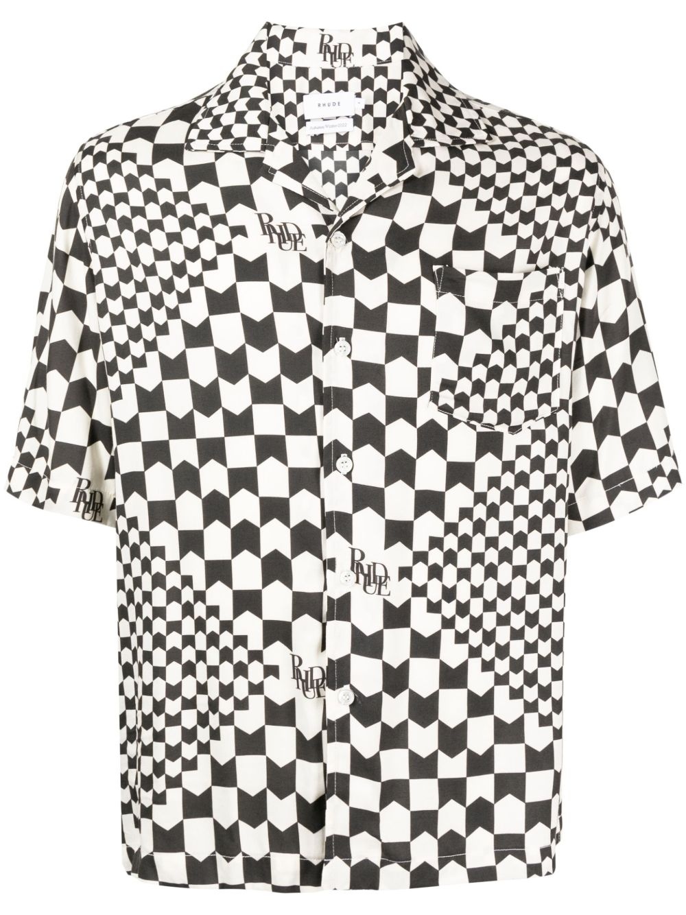 two-tone geometric-print shirt Highlights - Black/white - Cotton - Geometric print - Spread collar - Front button fastening - Short sleeves - Chest patch pocket Made in United States Composition Cotton 100% SIZE & FIT Model measurements Height 6 ft 2 in(1.87 m) Bust/Chest 34.25 in(87 cm) Hips 36.22 in(92 cm) Waist 29.52 in(75 cm) FittingInformation Designed for a boxy fit, intended for a loose fit throughout Made from a midweight non-stretch fabric This piece fits true to size – take your usual size Washing instructions Dry Clean Only