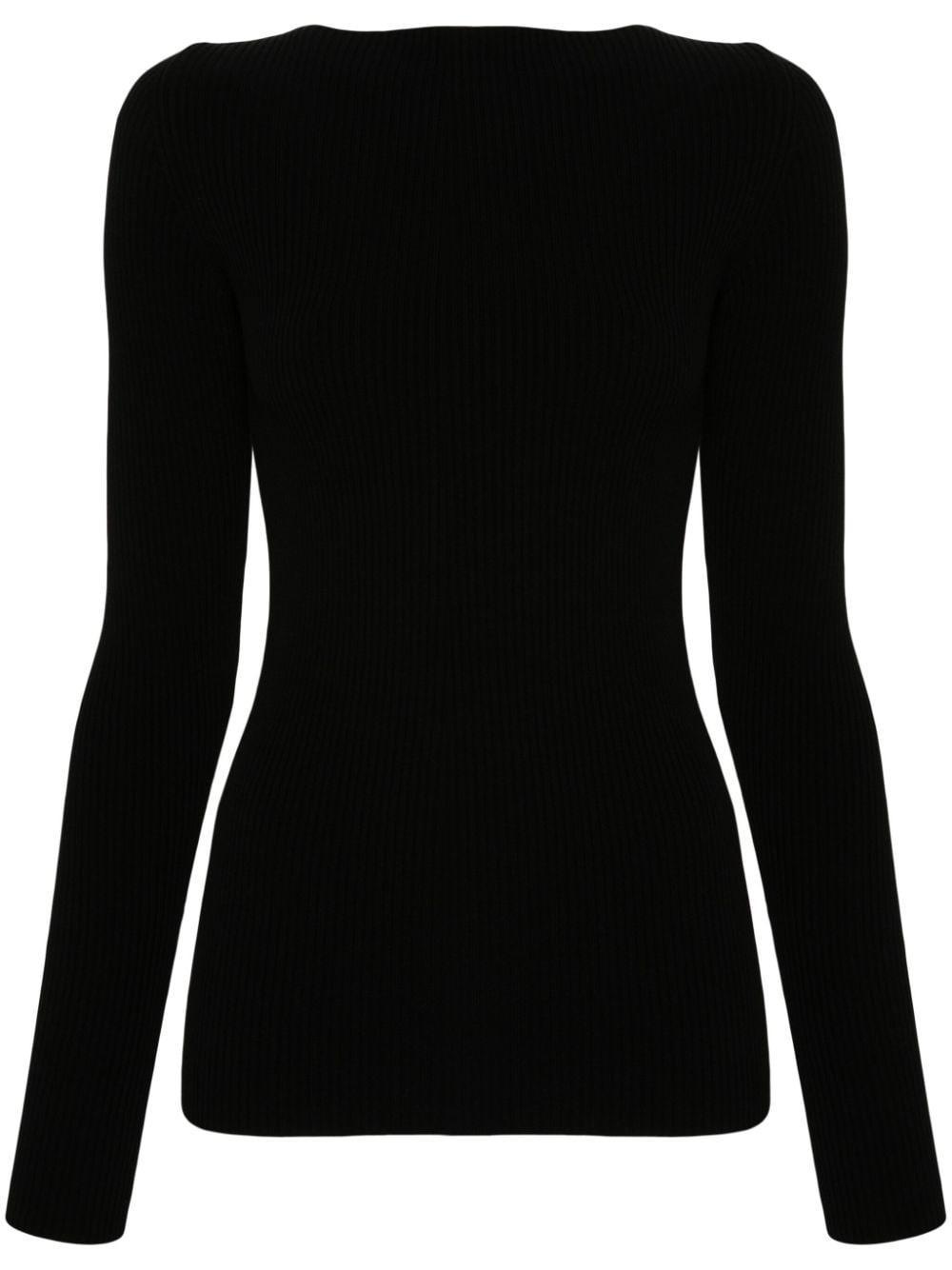 AL sweater Highlights - Black - Ribbed knit - Boat neck - Long sleeves - Cut-out detailing to the rear - Straight hem Made in Italy Composition EcoVero Viscose (LENZING) 68%, Polyester 32% SIZE & FIT Model measurements Height 5 ft 10 in(1.78 m) Bust/Chest 33.07 in(84 cm) Hips 36.61 in(93 cm) Waist 24.8 in(63 cm) FittingInformation Designed for a close fit throughout Made with a midweight knit, this piece offers some stretch This piece fits true to size – take your usual size Washing instructions Hand Wash