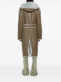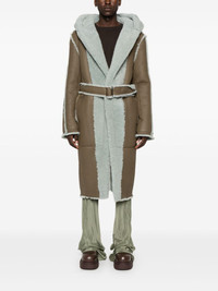 belted coat Highlights - Olive green/blue-grey - Lambskin/shearling - Contrasting trim - Classic hood - Shawl lapels - Long sleeves - Belted waist - Two side slit pockets - Central rear vent - Shearling lining - Straight hem - Mid-length Made in Italy Composition Lining: Cotton 100% Outer: Lambskin 100% SIZE & FIT Model measurements Height 6 ft 2 in(1.87 m) Bust/Chest 36.41 in(92.5 cm) Hips 37 in(94 cm) Waist 29.52 in(75 cm) FittingInformation Designed for a slim fit, offering a comfortable fit that sits just away from the body The belt offers adjustability for fitted preferences Firm shearling has a treated construction offering some durability