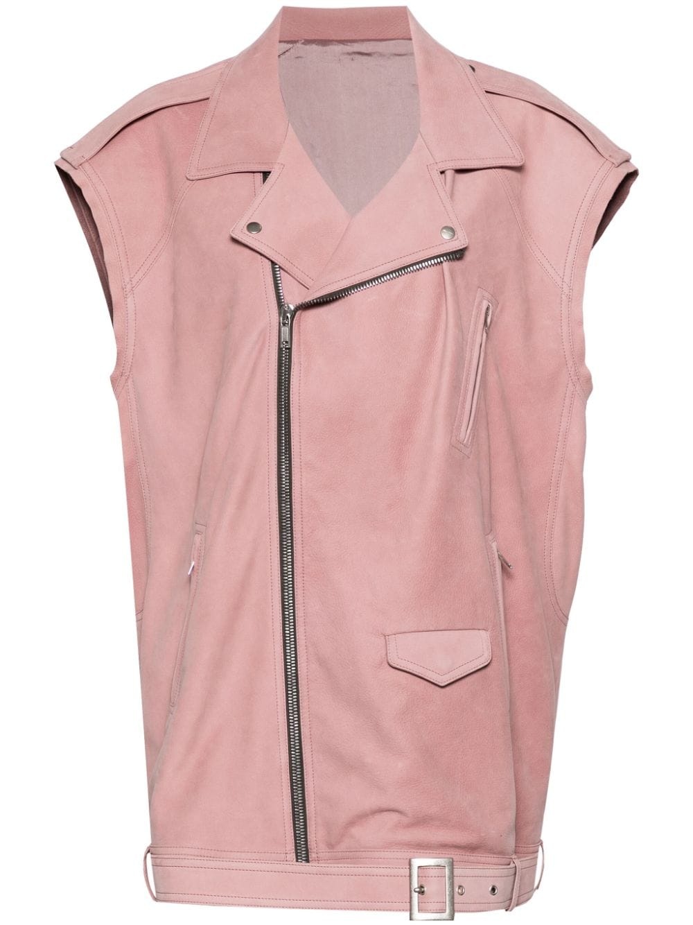biker-style leather waistcoat Highlights - Rose pink - Calf leather - Smooth grain - Panelled design - Epaulettes - Notched lapels - Off-centre front zip fastening - Sleeveless - Front flap pocket - Multiple zip-fastening pockets - Belted hem - Cotton lining Made in Italy Composition Outer: Calf Leather 100% Lining: Cotton 100% SIZE & FIT Model measurements Height 5 ft 9 in(1.76 m) Bust/Chest 29.13 in(74 cm) Hips 33.07 in(84 cm) Waist 22.83 in(58 cm) Measurement BUST 58.26 in(148 cm) LENGTH 31.1 in(79 cm) Shoulder Width 24.4 in(62 cm) WAIST 55.9 in(142 cm) FittingInformation Designed for an oversized fit, offering additional room throughout Suede leather has a soft and treated construction offering some flexibility This piece fits true to size – take your usual size