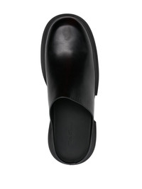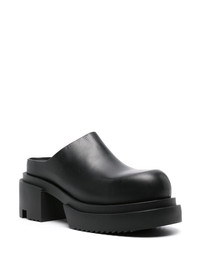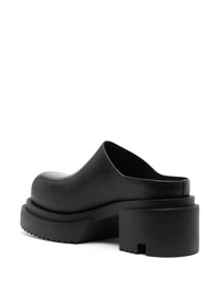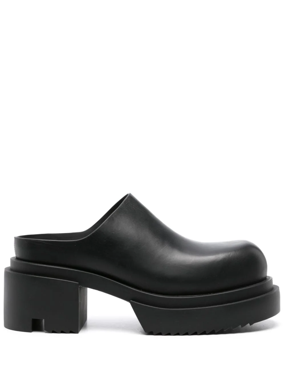 Bogun chunky leather slippers Rick Owens offers the slide iteration of the Bogun style. This backless iteration boasts an oversized sole with a toothed, square heel. Highlights - Calf leather - Black - Smooth grain - Round toe - Open back - Moulded branded leather footbed - 60mm mid block heel - 40mm platform sole - Rubber outsole - Slip-on style Made in Italy Composition Outer: Calf Leather 100% Lining: Calf Leather 100% Sole: Rubber 100% SIZE & FIT Measurement HEEL 4.13 in(10.5 cm) Sole height 1.77 in(4.5 cm)