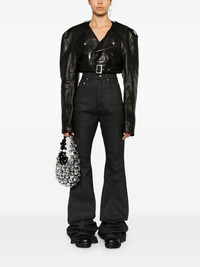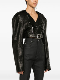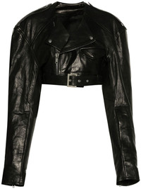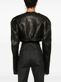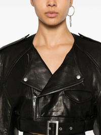 collarless cropped biker jacket Highlights - Black - Lambskin - Smooth grain - Seam detailing - Collarless - Off-centre front zip fastening - Epaulettes - Drop shoulder - Long sleeves - Cuff zips - Front flap pocket - Belted waist - Straight hem - Cropped Made in Italy Composition Lining: Cotton 100%, Cupro 100% Outer: Lamb Skin 100% SIZE & FIT Model measurements Height 5 ft 9 in(1.76 m) Bust/Chest 31.88 in(81 cm) Hips 35.43 in(90 cm) Waist 24.8 in(63 cm) FittingInformation Designed to be unstructured, offering a loose fit throughout The belt offers adjustability for fitted preferences Soft leather has a supple and smooth construction offering some flexibility This piece fits true to size – take your usual size