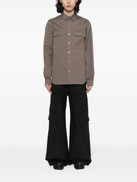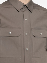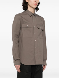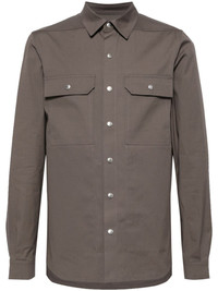 long-sleeve poplin shirt Rick Owens offers an understated everyday look with this shirt jacket. It is crafted from stretch cotton in a Dust brown hue and enhanced by the silver-tone press studs. Highlights - Taupe brown - Stretch-cotton - Classic collar - Front press-stud fastening - Long sleeves - Two chest flap pockets - Curved hem Made in Italy Composition Cotton 97%, Elastane 3% SIZE & FIT Model measurements Height 6 ft 2 in(1.87 m) Bust/Chest 33.07 in(84 cm) Hips 35.43 in(90 cm) Waist 26.77 in(68 cm) FittingInformation Designed to be unstructured, offering a loose fit throughout Made from a midweight stretch fabric, this piece offers elasticity and flexibility when worn This piece fits true to size – take your usual size Washing instructions Dry Clean Only