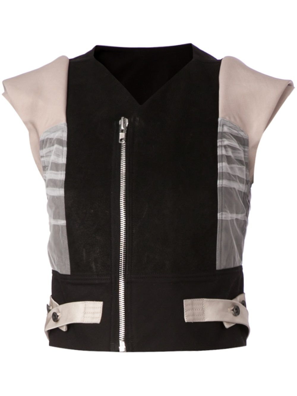 cropped gilet Black silk and calf leather cropped gilet from Rick Owens featuring a v-neck, a front zip fastening, cap sleeves and side waist tabs. Made in Italy Composition Polyamide 100%, Calf Leather 100%, Silk 100% Washing instructions Specialist Cleaning