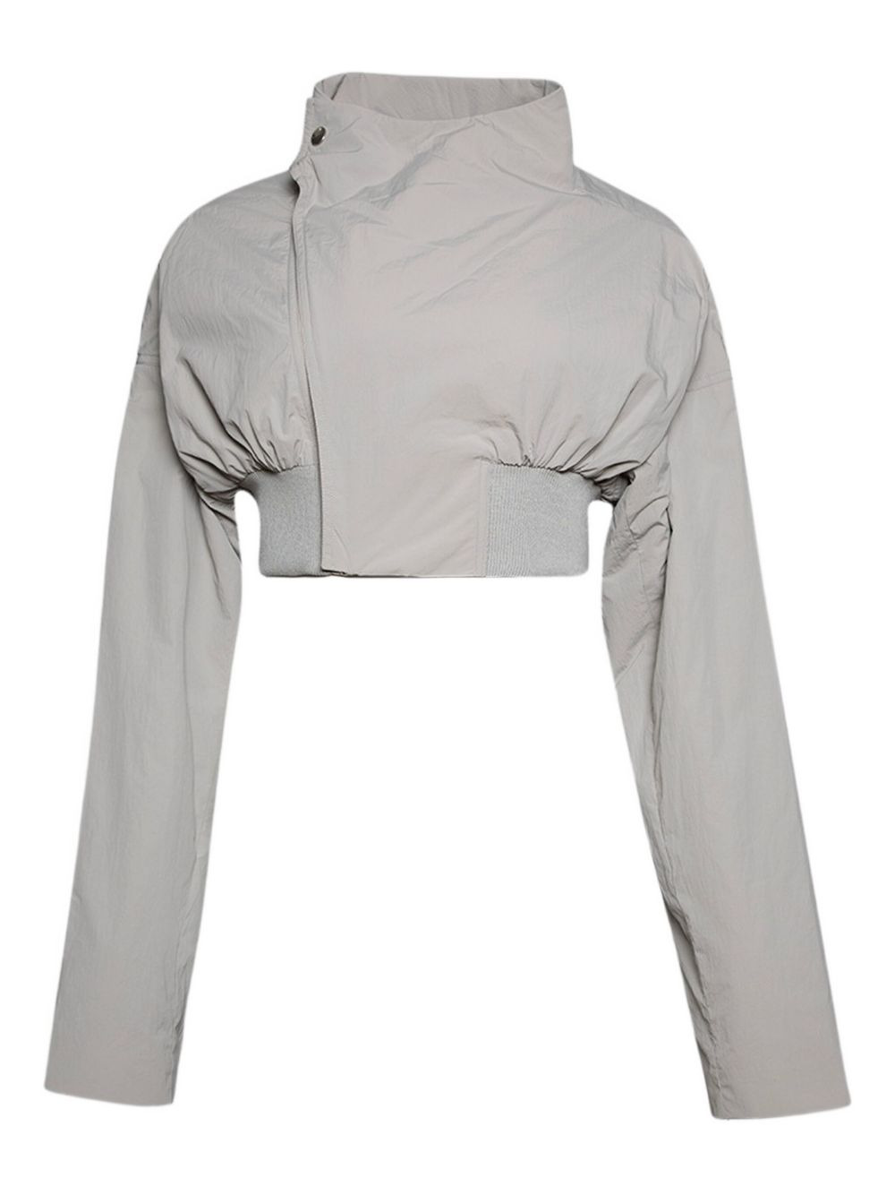 cropped zip-front bomber jacket Highlights - Pearl grey - Zip fastening - Elasticated waistband - Wide sleeves - High neck - Snap button closure Imported Composition Viscose 82%, Silk 18% Washing instructions Read Manufacturer Guidelines
