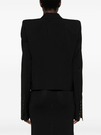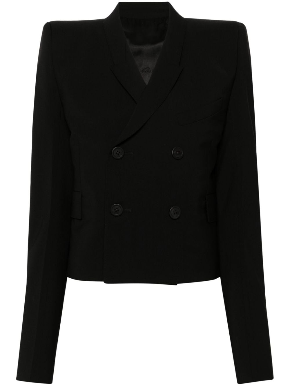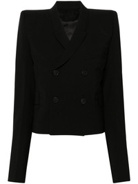 double-breasted wool blazer Spun from virgin wool, this Rick Owens blazer is cut to a double-breasted silhouette and is enhanced with peak lapels. Highlights - Black - Virgin wool - Interlock weave - Peak lapels - Shoulder pads - Long sleeves - Buttoned-cuff sleeves - Chest welt pocket - Two side flap pockets - Two internal slip pockets - Full lining - Front button fastening Made in Italy Composition Outer: Virgin Wool 100% Lining: Cotton 100%, Viscose 53%, Cupro 47% SIZE & FIT Model measurements Height 5 ft 10 in(1.77 m) Bust/Chest 32.28 in(82 cm) Hips 35.03 in(89 cm) Waist 25.19 in(64 cm) FittingInformation Designed for a slim fit that sits just away from the body offering a close yet comfortable fit The internal shoulder pads offer a structured shape Made from a midweight non-stretch fabric This piece fits true to size – take your usual size