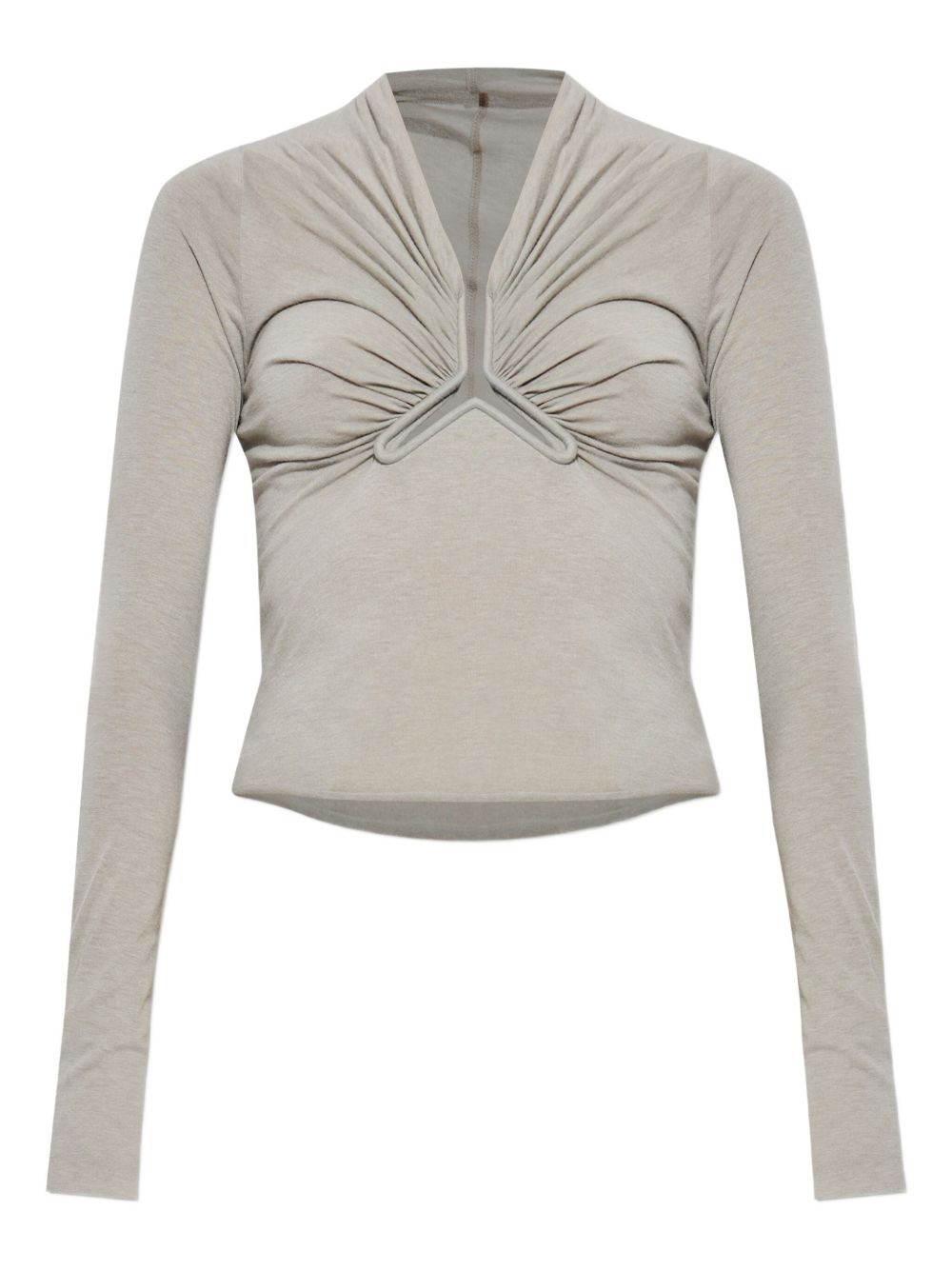 draped-neck long-sleeve T-shirt Highlights - Grey - Draped neckline - Long sleeves - V-neck Made in Italy Composition Wool 40%, Viscose 30%, Nylon 30% Washing instructions Read Manufacturer Guidelines