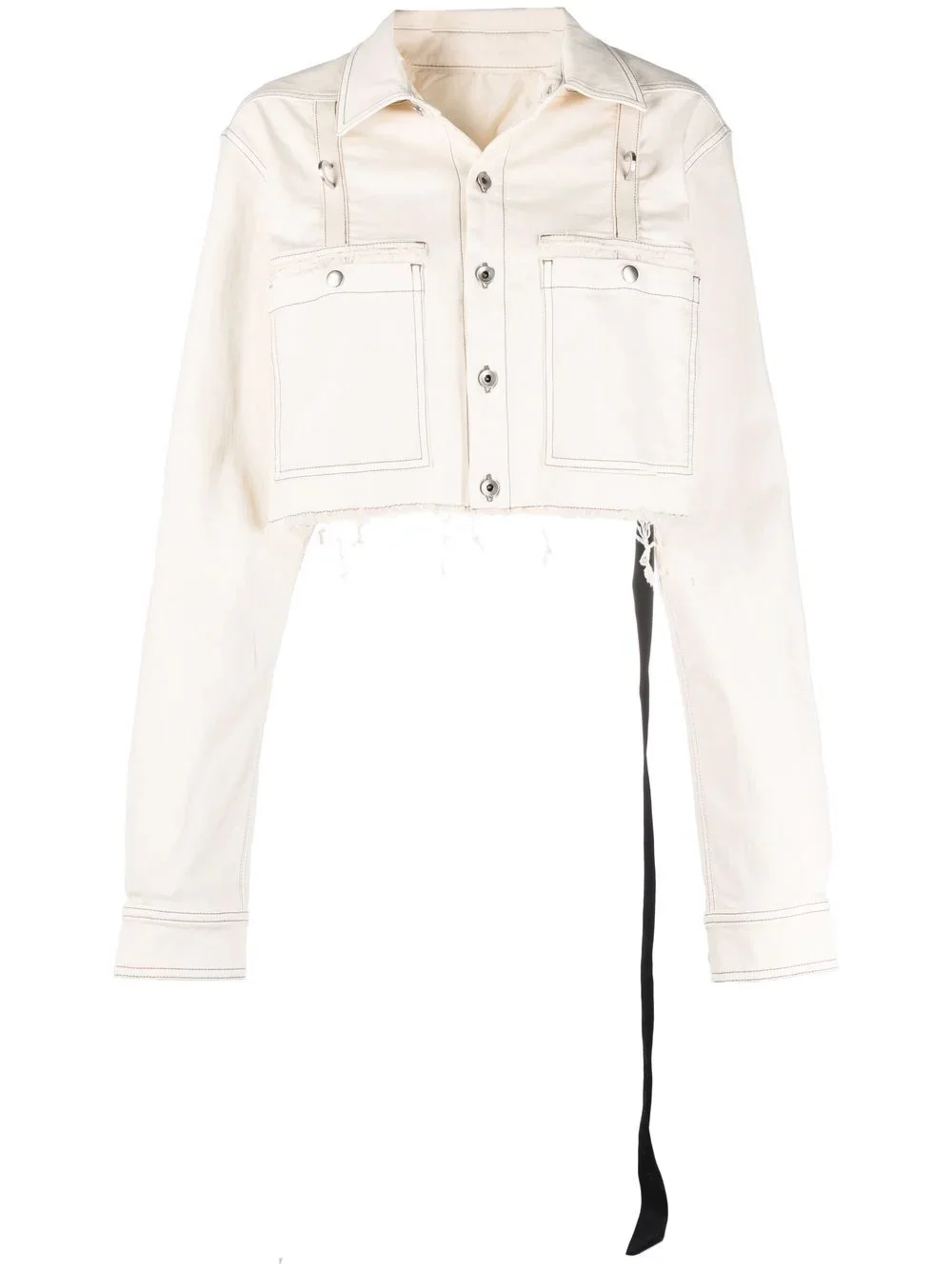 cropped denim button-up jacket white cotton blend classic collar front button fastening button pouch pockets fringed edge buttoned-cuff sleeves Made in Italy Composition Outer: Cotton 90%, Polyester 7%, Rubber 3% Lining: Cotton 100% SIZE & FIT Model measurements Height 5 ft 10 in(1.78 m) Bust/Chest 33.07 in(84 cm) Hips 35.82 in(91 cm) Waist 25.98 in(66 cm) FittingInformation This piece fits true to size. We recommend you get your regular size Cut for a loose fit Made with a mid-weight non-stretch fabric Washing instructions Hand Wash