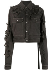 distressed-effect cropped denim jacket Showcasing its penchant for eye-catching silhouettes, Rick Owens DRKSHDW presents this jacket. The piece arrives in the brand's 'Dark Dust' colourway and features ripped detailing throughout which combines with the cropped cut for a striking finish. Highlights - Dark grey - Cotton blend - Distressed effect - Two front patch pockets - Front button fastening - Classic collar - Long sleeves - Straight hem - Cropped Made in Italy Composition Cotton 90%, Polyester 7%, Synthetic Rubber 3% SIZE & FIT Model measurements Height 5 ft 10 in(1.79 m) Bust/Chest 31.49 in(80 cm) Hips 35.03 in(89 cm) Waist 23.62 in(60 cm) FittingInformation Designed to be unstructured, offering a loose fit throughout Constructed from stretch denim, this piece offers a stretch fit with durability This piece fits true to size – take your usual size