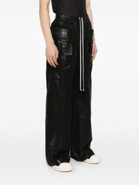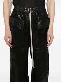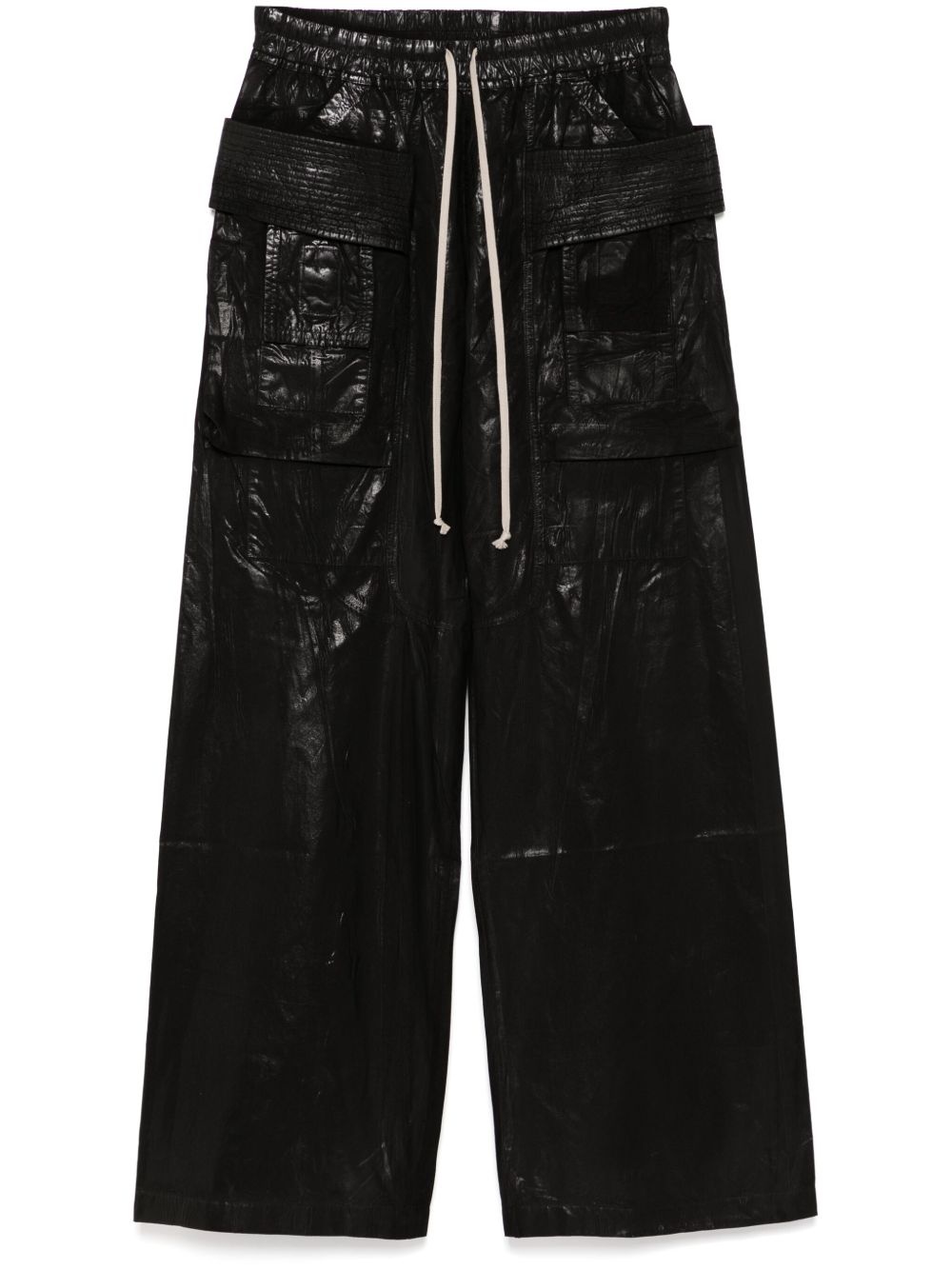 Hollywood creatch wide cargo trousers Highlights - Black - Elasticated drawstring waistband - Two side inset pockets - Two rear flap pockets Made in Italy Composition Organic Cotton 97%, Elastane 3% SIZE & FIT Model measurements Height 6 ft 2 in(1.87 m) Bust/Chest 33.07 in(84 cm) Hips 35.43 in(90 cm) Waist 26.77 in(68 cm) Measurement FRONT RISE 14.17 in(36 cm) INSIDE LEG 32.67 in(83 cm) HIPS 48.42 in(123 cm) FittingInformation Designed with a wide leg, offering a loose and roomy fit The elasticated waist allows for a comfortable fit Made from a midweight stretch fabric, this piece offers elasticity and flexibility when worn