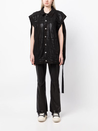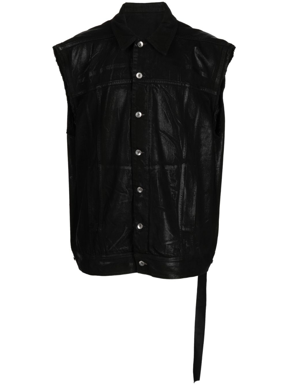 sleeveless wax-coated cotton vest Highlights - Jet black - Cotton - Denim - Wax coated - Frayed edge - Classic collar - Front button fastening - Sleeveless - Straight hem - When buying this unisex item, keep in mind that it is graded in standard men's sizing. Made in Italy Composition Body: Cotton 100% Lining: Polyester 52%, Cotton 48% SIZE & FIT Model measurements Height 5 ft 10 in(1.77 m) Bust/Chest 31.88 in(81 cm) Hips 33.85 in(86 cm) Waist 24.01 in(61 cm) FittingInformation This piece is unisex – if you usually select men's sizing expect a loose fit throughout; if you usually select women's sizes, expect an oversized fit Made from a midweight non-stretch fabric Washing instructions Hand Wash