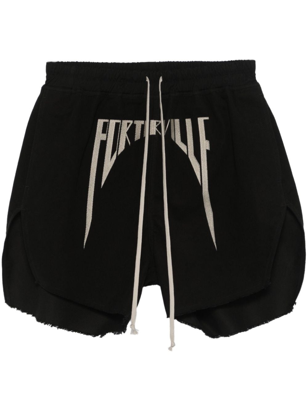 embroidered shorts Highlights - Black/light grey - Organic cotton - Twill weave - Embroidered motif - Elasticated drawstring waistband - Slip pockets to the sides - Side slits - Unlined - Frayed hem - Thigh-length Made in Italy Composition Polyester 100%, Organic Cotton 100% SIZE & FIT Model measurements Height 6 ft 1 in(1.85 m) Bust/Chest 35.82 in(91 cm) Hips 37.79 in(96 cm) Waist 29.13 in(74 cm) FittingInformation Designed for relaxed fit, offering a comfortable loose fit over the leg The elasticated waist allows for a comfortable fit Made from a midweight non-stretch fabric Measurement BACK RISE 15 in(38.1 cm) HIPS 42 in(106.7 cm) WAIST 27.99 in(71.1 cm) Washing instructions Dry Clean Only