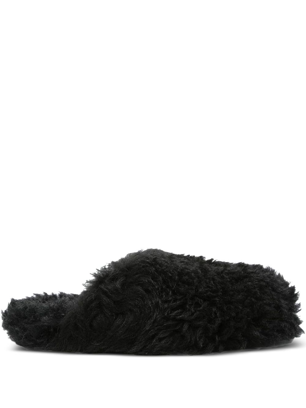 fluffy shearling slides Highlights - Black - Sheepskin - Open toe - Slip-on style - Flat sole - Shaggy texture Imported Composition Lining: Lamb Shearling 100% Sole: Rubber 100% Outer: Lamb Shearling 100%