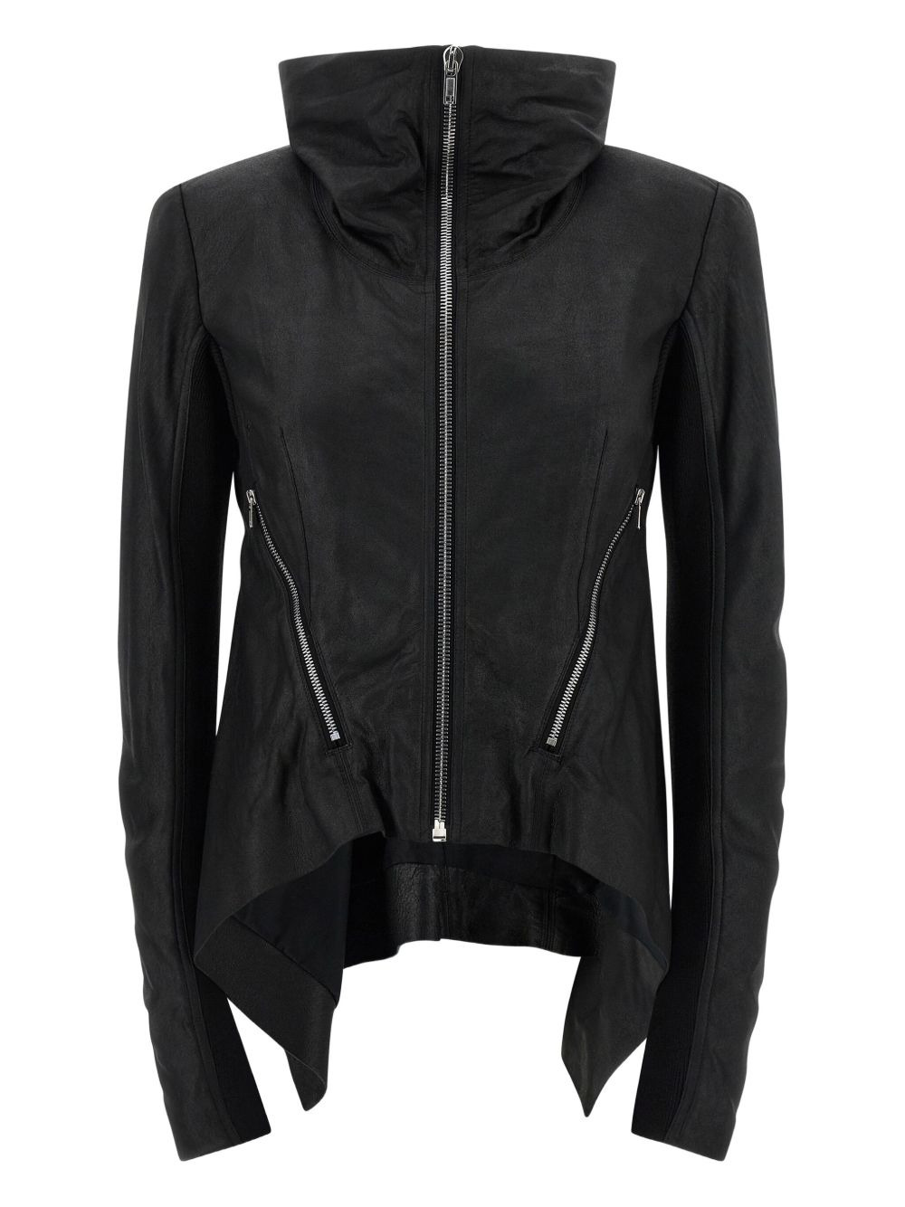 fold-neck zip-front leather jacket Highlights - Black - Lamb leather - Zip fastening - Foldable turtleneck - Asymmetric hem - Long sleeves - Ribbed knit inserts - Pockets Imported Composition Outer: Lamb Skin 100% Washing instructions Read Manufacturer Guidelines