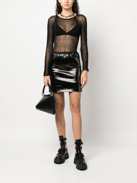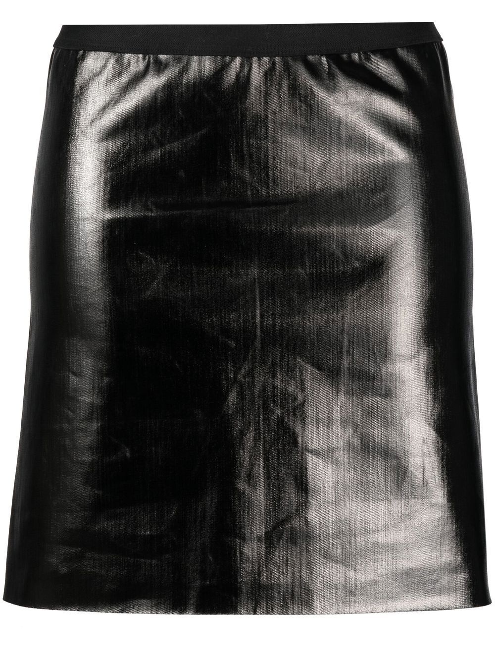 glossy-finish short skirt black glossy finish elasticated waistband raw-cut hem Made in Italy Composition Fabric 100% SIZE & FIT Model measurements Height 5 ft 10 in(1.79 m) Bust/Chest 33.07 in(84 cm) Hips 35.82 in(91 cm) Waist 24.01 in(61 cm) FittingInformation This piece fits true to size. We recommend you get your regular size Cut for a slim fit Made with a mid-weight stretch fabric Washing instructions Dry Clean Only