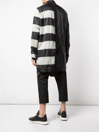humbug striped shirt jacket Richard Saturnino Owens, better known as Rick Owens, has turned his darkly glamorous, post-apocalyptic take on gothic grunge into a globally-renowned fashion business, built largely around his signature outerwear collection. This black nylon humbug striped shirt jacket from Rick Owens features a collar style, a mid-length, two chest patch pockets, a panelled colour block design and a snap button closure. Made in Italy Composition Nylon 100% SIZE & FIT Model measurements Height 6 ft 2 in(1.88 m) Bust/Chest 38.18 in(97 cm) Hips 37 in(94 cm) Waist 29.92 in(76 cm) Washing instructions Dry Clean Only