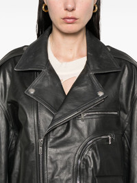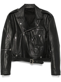 Jumbo Bauhaus Stooges biker jacket Highlights - Black - Off-centre front zip fastening - Cuff zips - Detachable and adjustable waist belt - Multiple zip-fastening pockets Made in Italy Composition Lining: Cupro 100% Outer: Calf Leather 100% SIZE & FIT Model measurements Height 5 ft 9 in(1.76 m) Bust/Chest 32.28 in(82 cm) Hips 35.43 in(90 cm) Waist 25.19 in(64 cm) Measurement BUST 51.18 in(130 cm) LENGTH 24.8 in(63 cm) Shoulder Width 22.44 in(57 cm) SLEEVE LENGTH 25.98 in(66 cm) WAIST 50.39 in(128 cm) FittingInformation Designed for a boxy fit, intended for a loose fit throughout The belt offers adjustability for fitted preferences Firm leather offering little flexibility to maintain its durability and sturdiness This piece is only produced in one size; for help with this item's sizing, refer to our product measurements