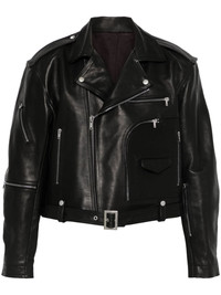 Jumbo Bauhaus Stooges jacket Highlights - Black - Leather - Smooth grain - Off-centre front zip fastening - Classic collar - Epaulettes - Drop shoulder - Long sleeves - Cuff zips - Multiple zip-fastening pockets - Front flap pocket - Belted waist - Full lining - Straight hem - Cropped Imported Composition Outer: Horse Leather 100% Lining: Nylon 100%, Cotton 100% SIZE & FIT Model measurements Height 6 ft 2 in(1.87 m) Bust/Chest 37.79 in(96 cm) Hips 37.79 in(96 cm) Waist 30.31 in(77 cm) Measurement CHEST 27.95 in(71 cm) LENGTH 24.01 in(61 cm) Shoulder Width 21.65 in(55 cm) SLEEVE LENGTH 25.98 in(66 cm) WAIST 24.8 in(63 cm) FittingInformation Designed for a boxy fit, intended for a loose fit throughout Firm leather offering little flexibility to maintain its durability and sturdiness This piece is only produced in one size; for help with this item's sizing, refer to our product measurements Washing instructions Specialist Cleaning
