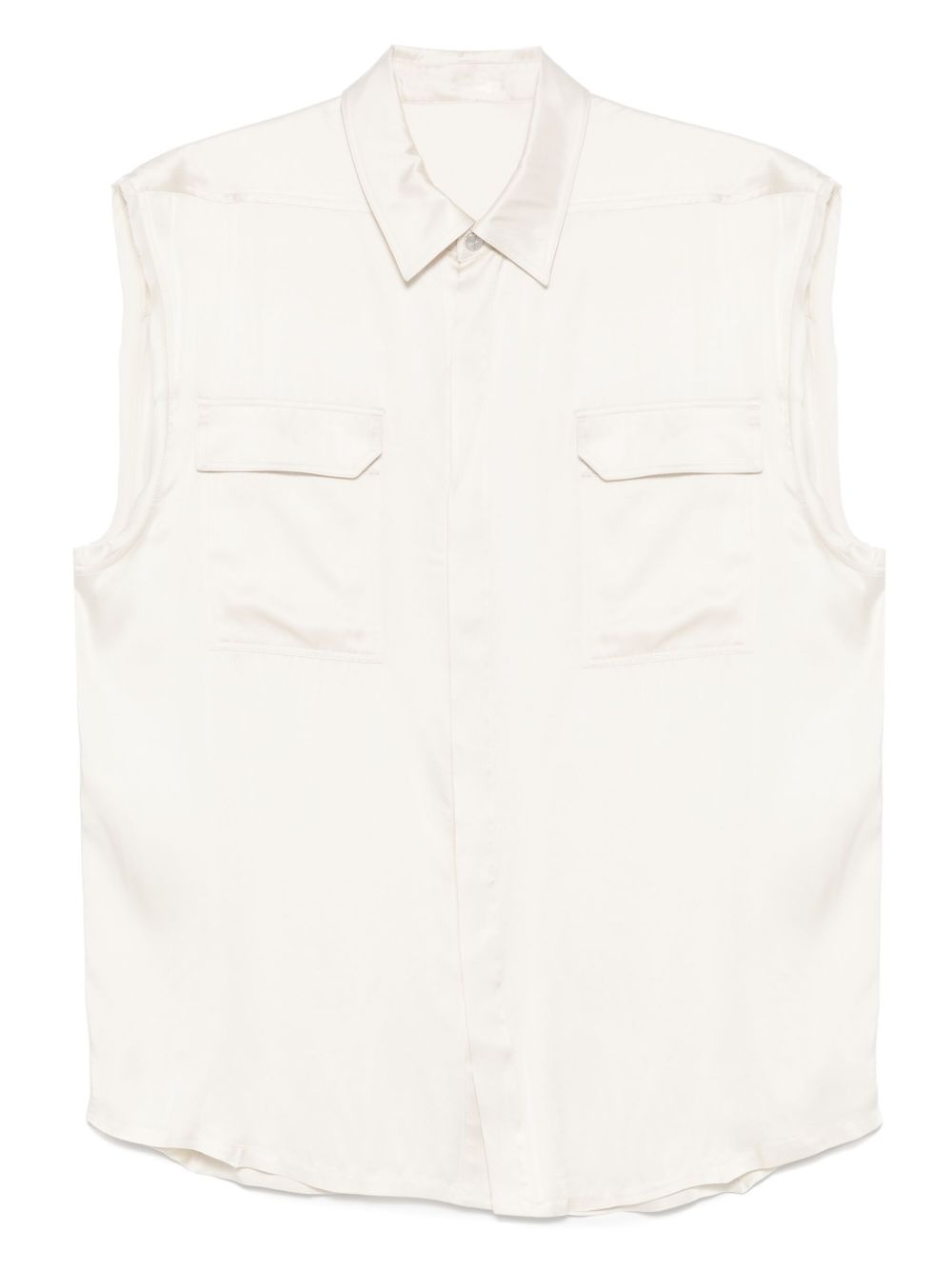Jumbo shirt Highlights - Almond beige - Front press-stud fastening - Two chest flap pockets - Sleeveless Made in Italy Composition Acetate 61%, Viscose 39% SIZE & FIT Model measurements Height 6 ft 2 in(1.87 m) Bust/Chest 36.22 in(92 cm) Hips 37 in(94 cm) Waist 27.95 in(71 cm) FittingInformation Designed to be unstructured, offering a loose fit throughout Made from a lightweight non-stretch fabric