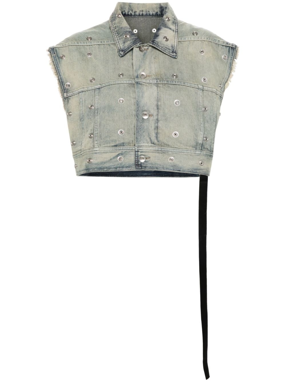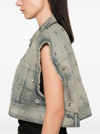 Jumbo Worker denim waistcoat Highlights - Sky blue - Cotton - Washed denim - Panelled design - Silver-tone hardware detailing - Decorative-button waist tabs - Strap detailing - Frayed edge - Classic collar - Drop shoulder - Sleeveless - Cropped - Straight hem - Unlined - Front button fastening Made in Italy Composition Cotton 100% SIZE & FIT Model measurements Height 5 ft 10 in(1.78 m) Bust/Chest 33.46 in(85 cm) Hips 36.22 in(92 cm) Waist 23.22 in(59 cm) FittingInformation Designed for an oversized fit, offering additional room throughout Cropped in length Sturdy and hard-wearing, this denim piece offers no stretch This piece fits true to size – take your usual size