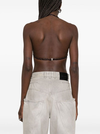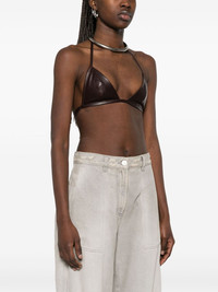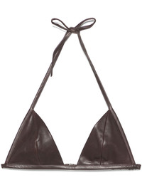 leather bra top Highlights - Ebony - Rear clasp fastening - Halterneck tie fastening - Cotton lining - Triangle cup Imported Composition Leather 100% SIZE & FIT Model measurements Height 5 ft 11 in(1.8 m) Bust/Chest 32.67 in(83 cm) Hips 36.22 in(92 cm) Waist 24.4 in(62 cm) FittingInformation Designed for a close fit throughout Soft leather has a supple and smooth construction offering some flexibility