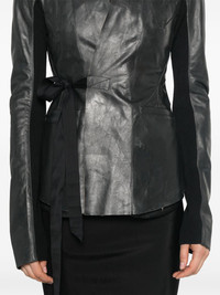 leather jacket Highlights - Black - Self-tie fastening - Two front welt pockets - Gathered detailing - Asymmetric hem - Please note that this product features a distressed leather finish, showcasing natural markings and variations in shading, Imported Composition Calf Leather 100% SIZE & FIT Model measurements Height 5 ft 11 in(1.8 m) Bust/Chest 33.07 in(84 cm) Hips 37.4 in(95 cm) Waist 25.19 in(64 cm) FittingInformation Designed for a wraparound style that can be adjusted to your preference The tie fastening gives an adaptable and personalised fit Firm leather offering little flexibility to maintain its durability and sturdiness