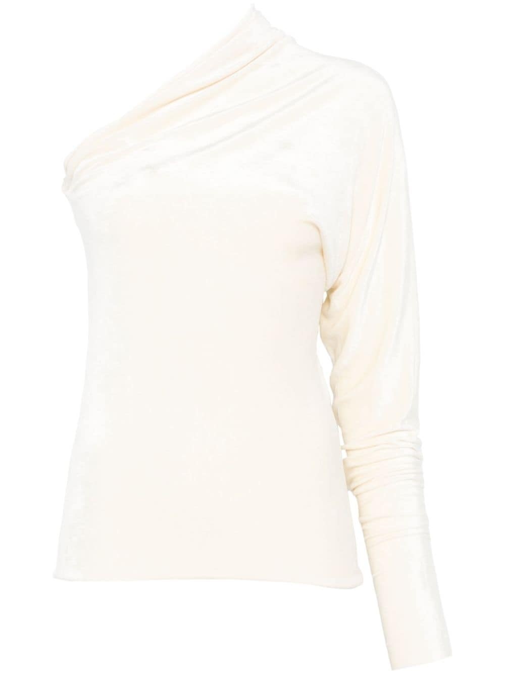 Diana top Highlights - Ecru - Velvet - Draped design - Asymmetric neck - Single long sleeve - Straight hem Made in Italy Composition Viscose 83%, Polyamide 17% SIZE & FIT Model measurements Height 5 ft 10 in(1.77 m) Bust/Chest 33.07 in(84 cm) Hips 37 in(94 cm) Waist 24.8 in(63 cm) FittingInformation Designed for a slim fit that sits just away from the body offering a close yet comfortable fit Made from a midweight non-stretch fabric, this piece offers minimal elasticity when worn