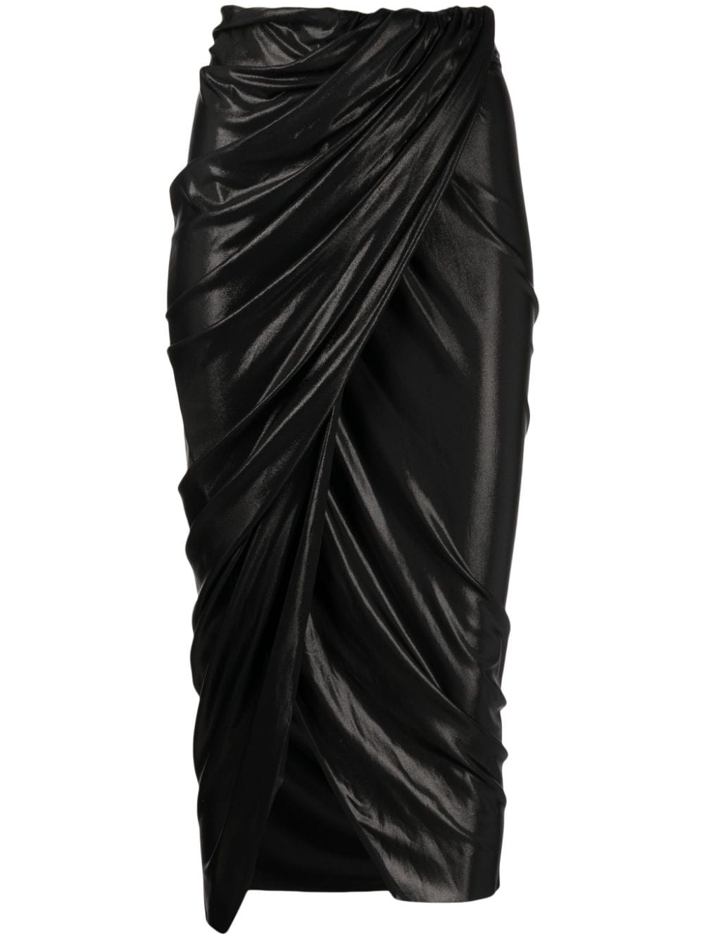 high-waisted draped skirt Highlights - Black - Stretch-design - Metallic finish - Draped detailing - Elasticated waistband - High-waisted - Front slit - Straight hem - Mid-length Made in Italy Composition Viscose 95%, Elastane 5% SIZE & FIT Model measurements Height 5 ft 10 in(1.77 m) Bust/Chest 33.46 in(85 cm) Hips 35.43 in(90 cm) Waist 23.62 in(60 cm) FittingInformation This midi-length skirt is intended to be worn just below the waist The elasticated waist allows for a comfortable fit Made from a midweight stretch fabric, this piece offers elasticity and flexibility when worn This piece fits true to size – take your usual size Washing instructions Hand Wash