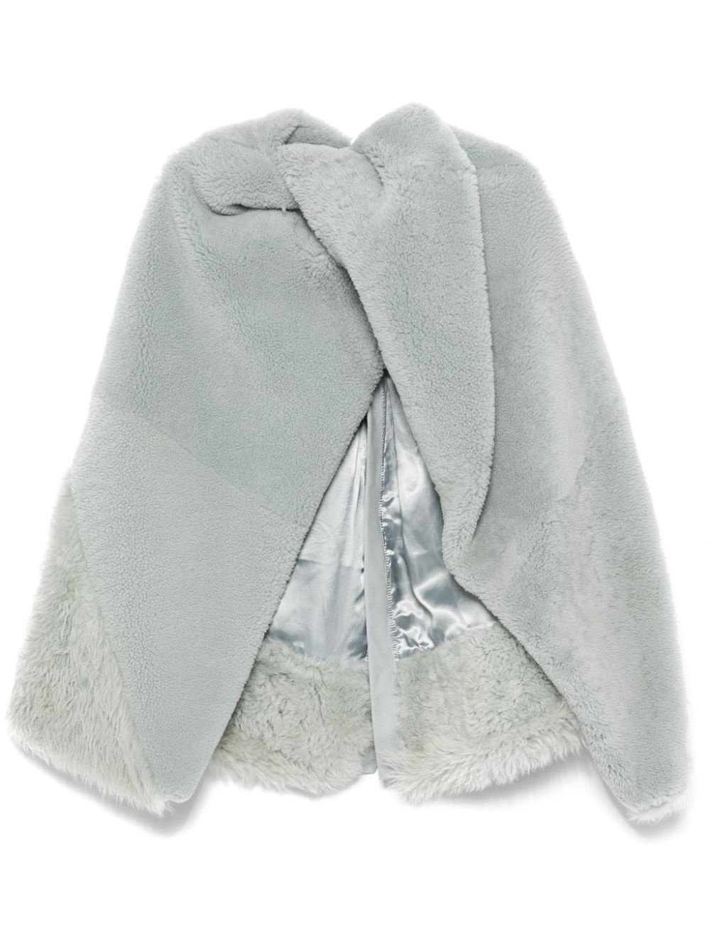 Masto cape Highlights - Pastel blue - Shearling - Rear zip fastening - Sleeveless - Knot detailing - Rear slit - Full lining - Asymmetric hem Made in Italy Composition Lining: Cupro 100% Outer: Sheep Skin/Shearling 100% SIZE & FIT Model measurements Height 5 ft 11 in(1.8 m) Bust/Chest 33.07 in(84 cm) Hips 37.4 in(95 cm) Waist 25.19 in(64 cm) FittingInformation Designed to be unstructured, offering a loose fit throughout Firm shearling has a treated construction offering some durability