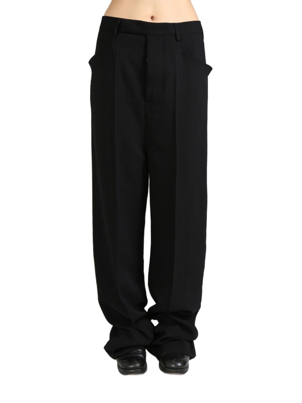 Mastodon trousers Highlights - Black - Concealed front fastening - Belt loops - Two side slash pockets - Pressed crease - Two rear welt pockets - Wide leg Made in Italy Composition Fabric 100% Washing instructions Read Manufacturer Guidelines