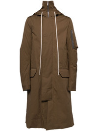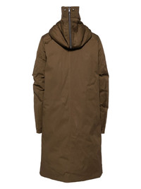Megaparka coat Highlights - Bean green - Padded design - Organic cotton blend - Concealed press-stud fastening - Concealed front zip fastening - Drawstring hood - Zipped hood - Funnel neck - Long sleeves - Sleeve zip pocket - Two front welt pockets - Two front flap pockets - Cotton lining - Internal zip-fastening pockets - Straight fit - Below-knee length Made in Italy Composition Outer: Organic Cotton 97%, Elastane 3% Filling: Polyester 90%, Acrylic 10% Lining: Cupro 100%