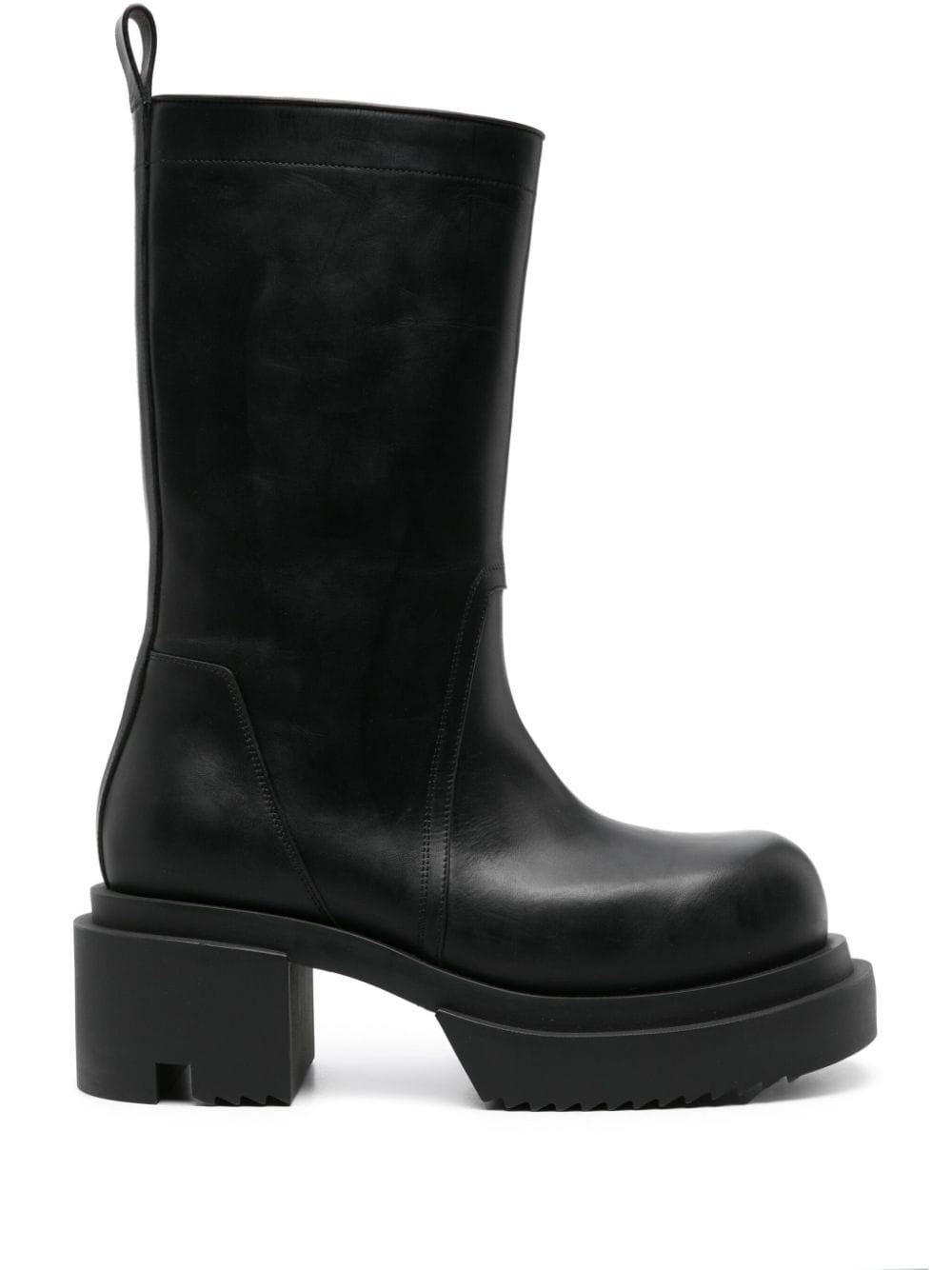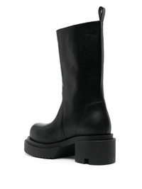 mid-calf leather plaform boots Highlights - Black - Calf leather - Smooth grain - Round toe - Mid-calf length - Pull-tab at the heel - Slip-on style - Ridged rubber platform sole - Branded leather insole - Leather lining Made in Italy Composition Outer: Calf Leather 100% Sole: Rubber 100% Lining: Calf Leather 100% SIZE & FIT Measurement CIRCUMFERENCE 13.38 in(34 cm) HEEL 3.14 in(8 cm) HEIGHT 11.81 in(30 cm) Sole height 1.77 in(4.5 cm)