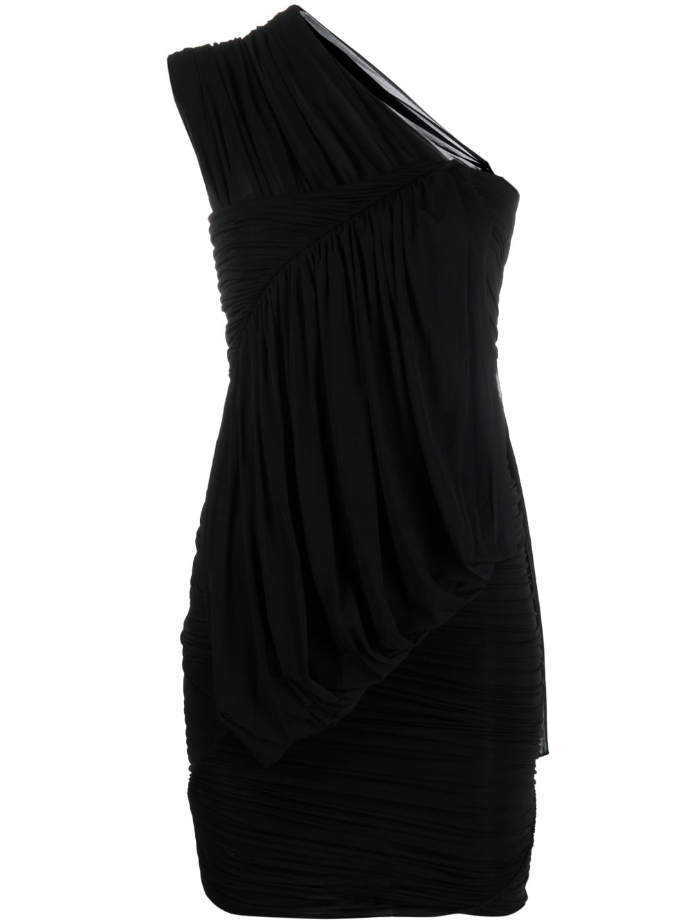 one-shoulder ruched minidress Following the brand's monochrome palette painted with gothic overtones, this one-shoulder dress from Rick Owens arrives in an all-black shade. This model features a stretch design elevated with ruched detailing throughout. Highlights - Black - Stretch-design - Ruched detailing - One-shoulder - Straight hem Made in Italy Composition Cupro 92%, Elastane 8% SIZE & FIT Model measurements Height 5 ft 10 in(1.78 m) Bust/Chest 30.7 in(78 cm) Hips 34.64 in(88 cm) Waist 23.22 in(59 cm) Measurement HIPS 29.13 in(74 cm) LENGTH 30.7 in(78 cm) WAIST 25.19 in(64 cm) FittingInformation Designed for a close fit throughout Made from a midweight stretch fabric, this piece offers elasticity and flexibility when worn This piece fits true to size – take your usual size