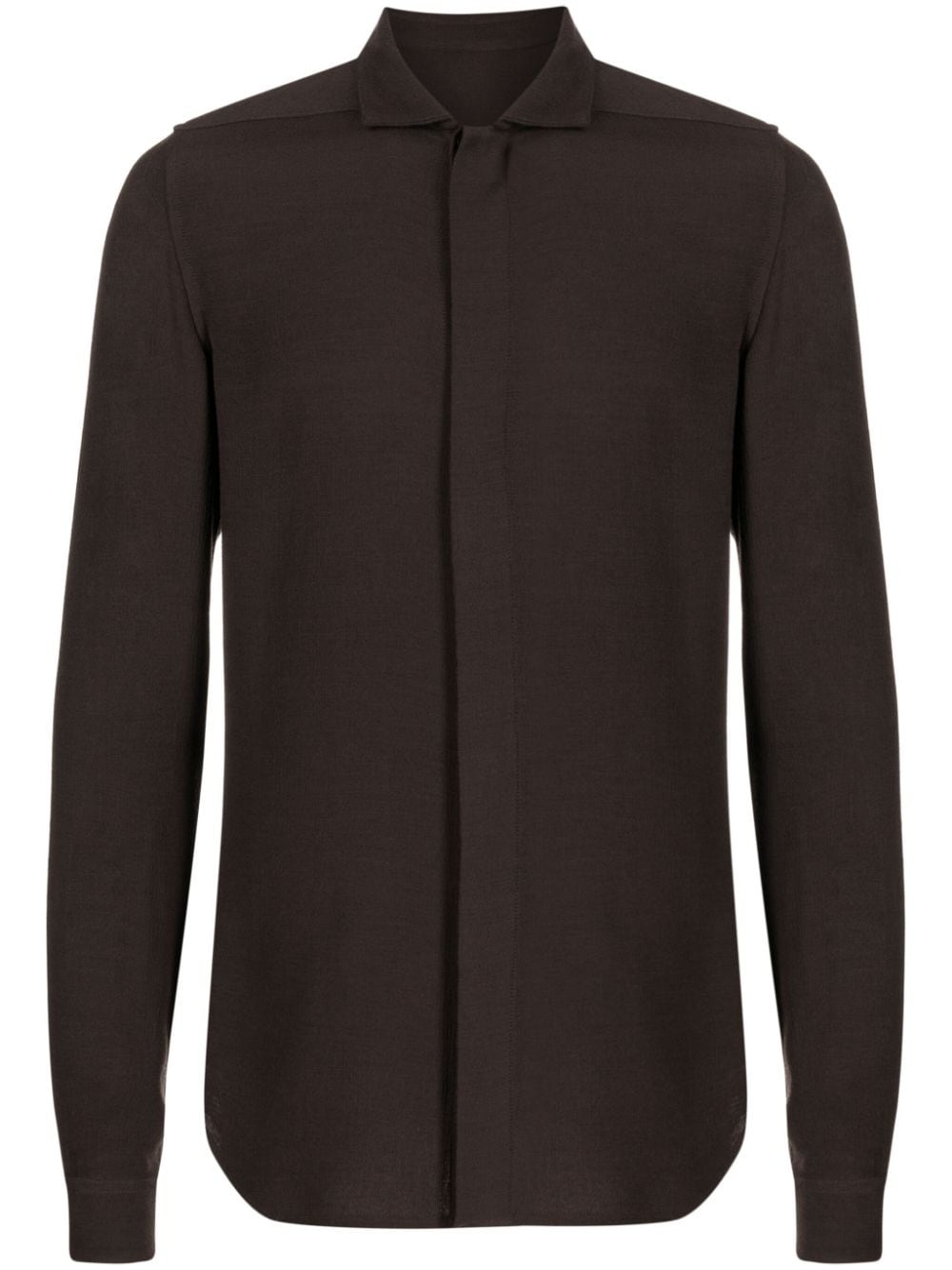 plain long-sleeve shirt Highlights - Brown - Wool blend - Classic collar - Concealed front fastening - Long sleeves - Curved hem Made in Italy Composition Viscose 87%, Wool 13% SIZE & FIT Model measurements Height 6 ft 2 in(1.87 m) Bust/Chest 33.07 in(84 cm) Hips 35.43 in(90 cm) Waist 26.77 in(68 cm) FittingInformation Designed for a regular fit, allowing for a comfortably loose fit throughout the body Made from a midweight non-stretch fabric This piece fits true to size – take your usual size Washing instructions Dry Clean Only