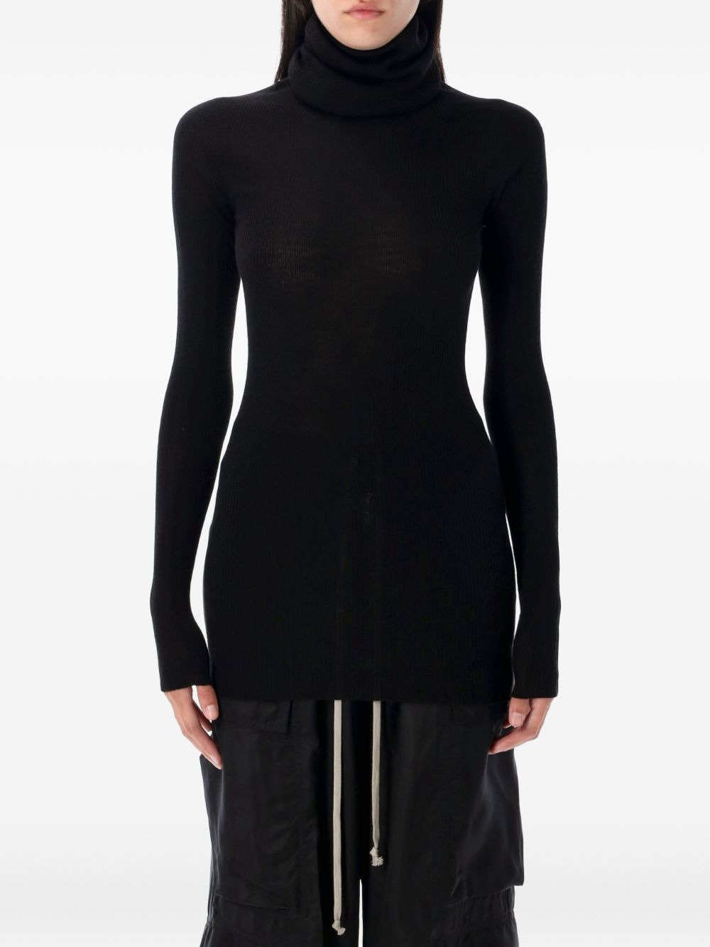 ribbed turtleneck top Highlights - Black - Turtleneck - Ribbed texture - Long sleeves - Straight hemline Made in Italy Composition Virgin Wool 100% Washing instructions Read Manufacturer Guidelines