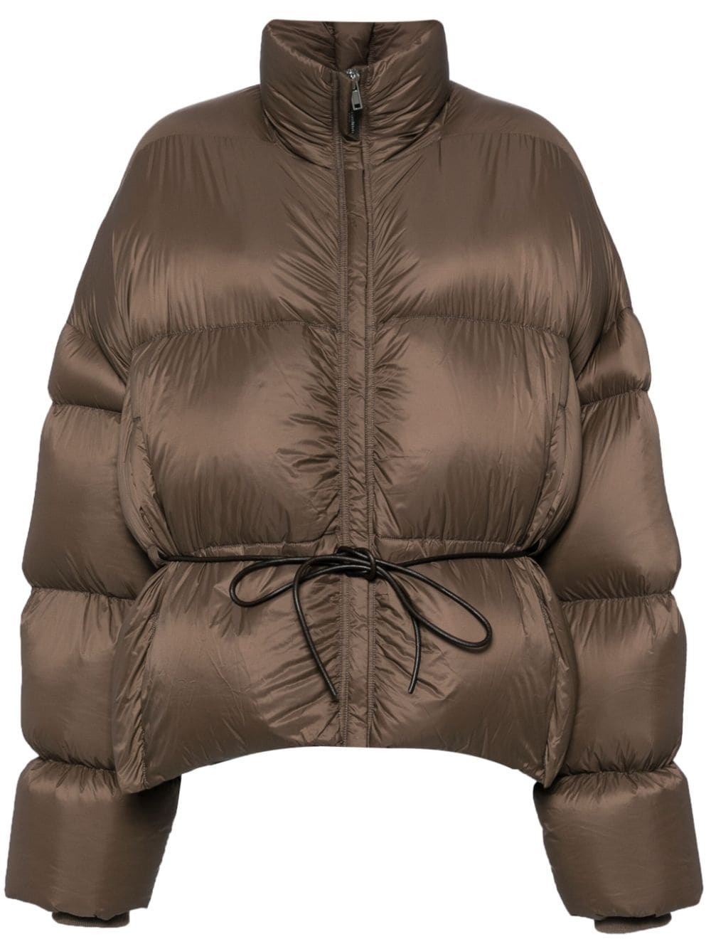 sail duvet jacket Highlights - Fawn brown - Quilted - Down-feather filling - Padded panels - Concealed front zip fastening - Funnel neck - Drop shoulder - Long sleeves - Ribbed cuffs - Two press-stud fastening side pockets - Leather drawstring fastening waist - Rear zip fastening - Internal zip-fastening pockets - Full lining Made in Italy Composition Other fibres 100% SIZE & FIT Model measurements Height 5 ft 9 in(1.76 m) Bust/Chest 31.1 in(79 cm) Hips 35.03 in(89 cm) Waist 24.4 in(62 cm) Measurement BUST 66.92 in(170 cm) LENGTH 31.49 in(80 cm) Shoulder Width 30.7 in(78 cm) SLEEVE LENGTH 25.19 in(64 cm) WAIST 50.39 in(128 cm) FittingInformation Designed for an oversized fit, offering additional room throughout The tie fastening gives an adaptable and personalised fit Made from a padded non-stretch fabric, giving it no natural elasticity