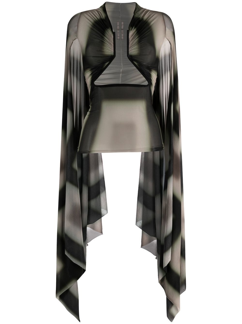 semi-sheer draped top jet black semi-sheer construction abstract pattern print round neck long sleeves draped design Made in Italy Composition Cupro 92%, Spandex/Elastane 8% SIZE & FIT Model measurements Height 5 ft 10 in(1.77 m) Bust/Chest 29.92 in(76 cm) Hips 34.25 in(87 cm) Waist 23.62 in(60 cm) FittingInformation This piece fits true to size. We recommend you get your regular size Cut for a close fit Made with a lightweight stretch fabric Washing instructions Dry Clean Only