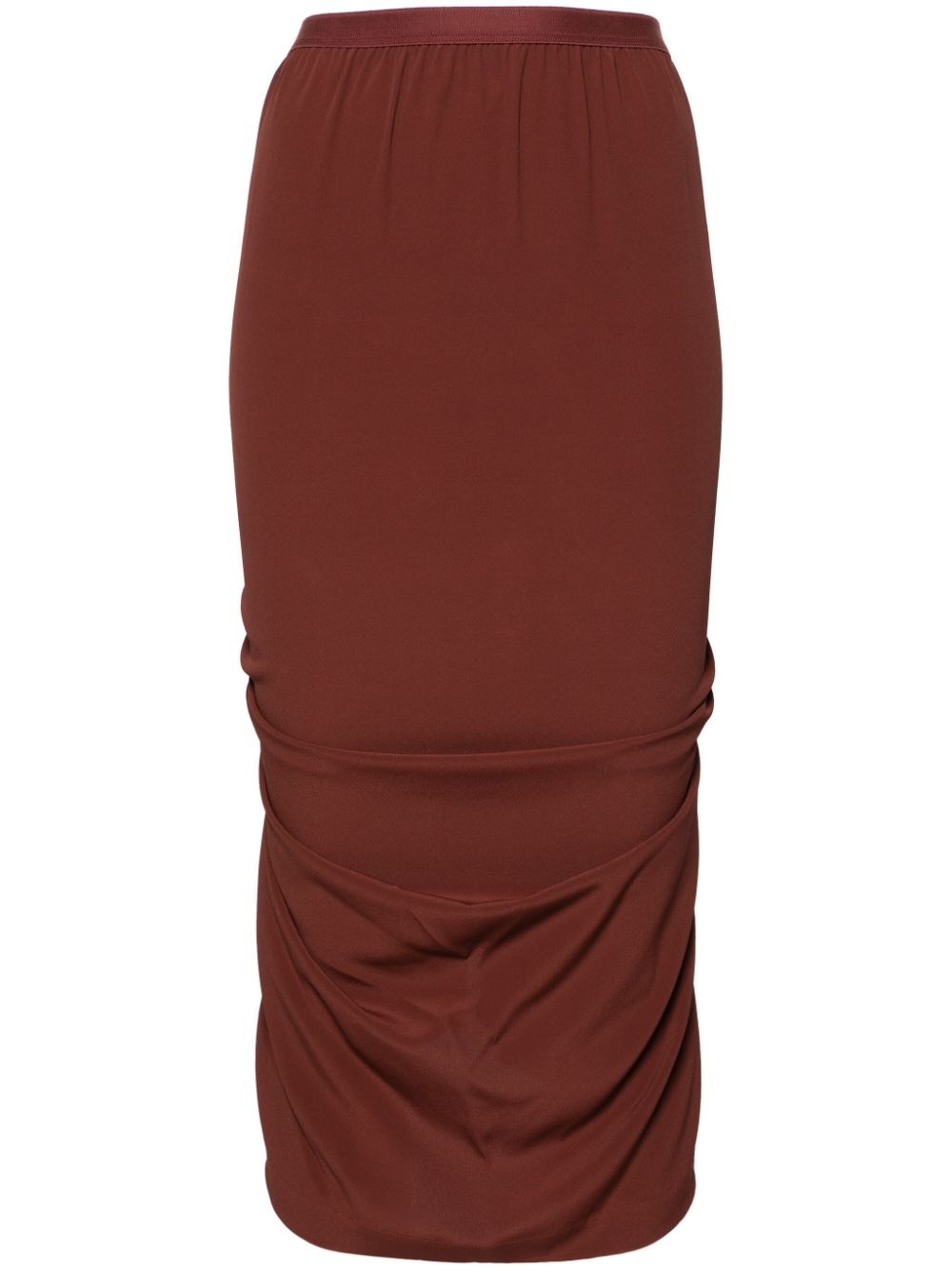 Shrimp draped midi skirt Highlights - Chestnut brown - Crepe texture - Draped design - Ruched detailing - Elasticated waistband - Asymmetric hem - Mid-length - Unlined Made in Italy Composition Acetate 64%, Silk 36% SIZE & FIT Model measurements Height 5 ft 11 in(1.8 m) Bust/Chest 31.49 in(80 cm) Hips 36.61 in(93 cm) Waist 24.4 in(62 cm) FittingInformation This midi-length skirt is intended to be worn just below the waist The elasticated waist allows for a comfortable fit Made from a lightweight non-stretch fabric This piece fits true to size – take your usual size