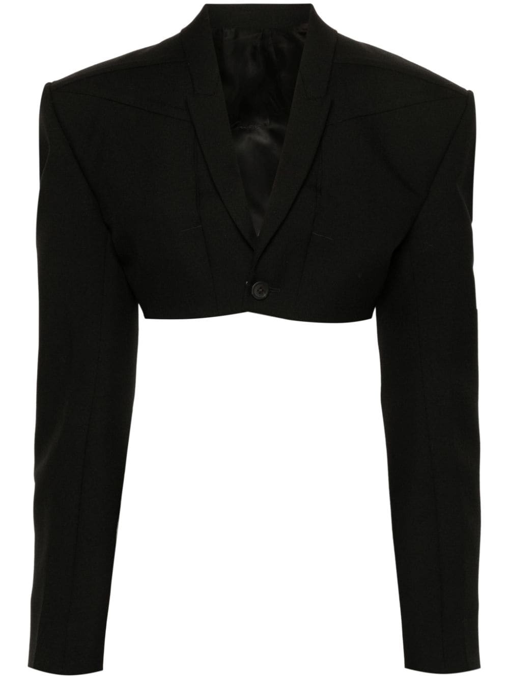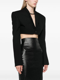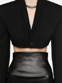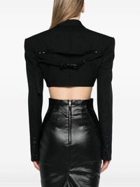Tatlin strap-detail cropped blazer Highlights - Black - Virgin wool - Tailored design - Adjustable strap to the rear - Shawl lapels - Front button fastening - Shoulder pads - Long sleeves with buttoned cuffs - Cropped straight hem Made in Italy Composition Cupro 100%, Cotton 100%, Virgin Wool 100%, Buffalo Horn 100% SIZE & FIT Model measurements Height 5 ft 11 in(1.8 m) Bust/Chest 32.67 in(83 cm) Hips 36.22 in(92 cm) Waist 25.19 in(64 cm) FittingInformation Designed for a slim fit that sits just away from the body offering a close yet comfortable fit The internal shoulder pads offer a structured shape Made from a midweight non-stretch fabric This piece fits true to size – take your usual size
