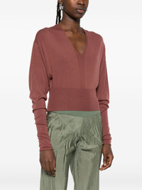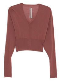 v-neck sweater Highlights - Rosewood - V-neck - Long sleeves - Ribbed hem - Cropped length Made in Italy Composition RWS Virgin Wool 100% SIZE & FIT Model measurements Height 5 ft 11 in(1.8 m) Bust/Chest 32.67 in(83 cm) Hips 36.22 in(92 cm) Waist 24.4 in(62 cm) Washing instructions Hand Wash
